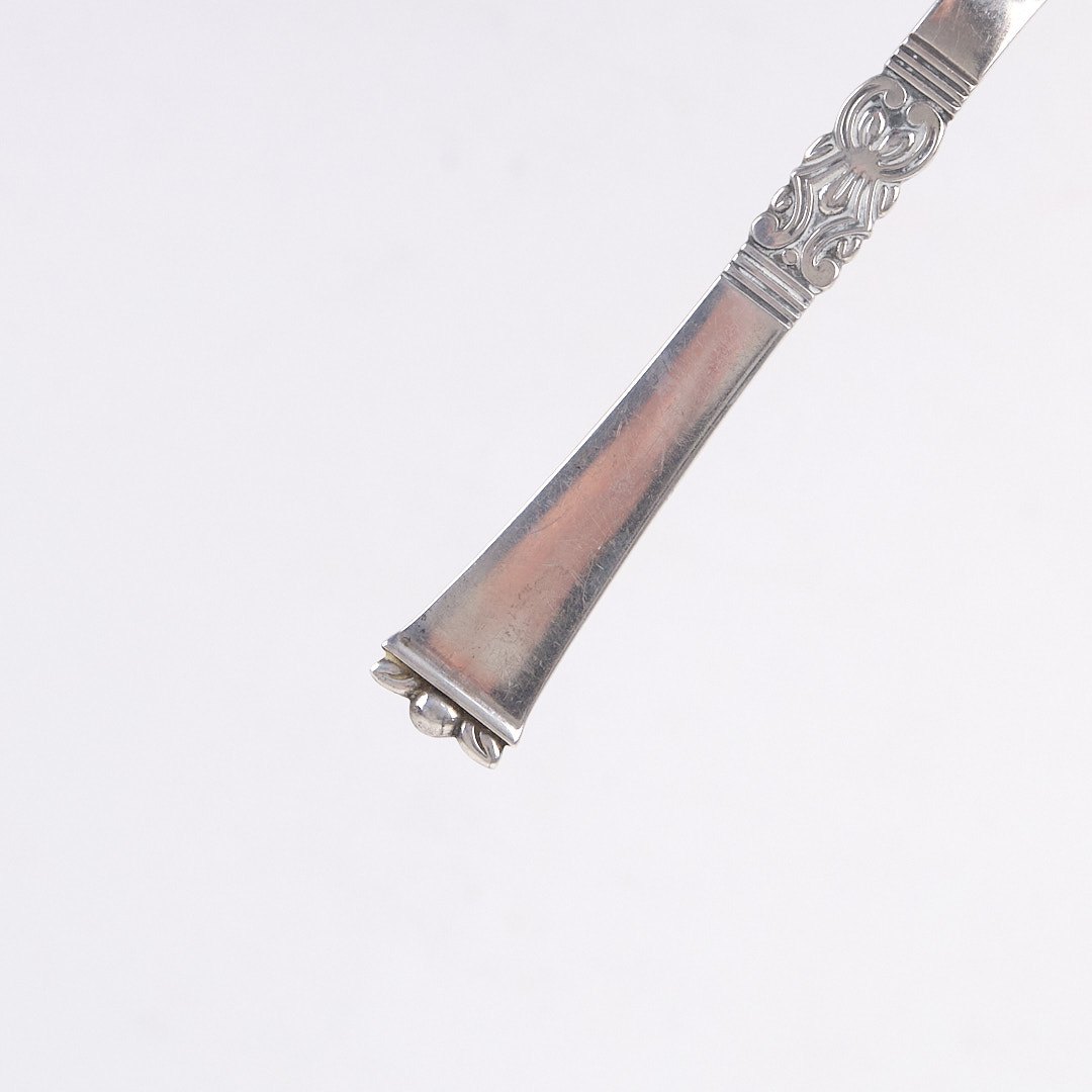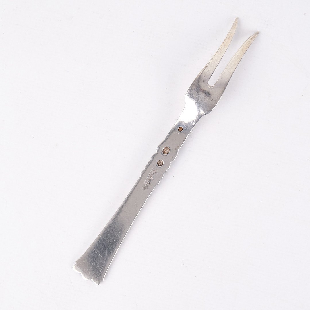 Pålægsgaffel i Rigsmønstret design af Poul Frigast. Sølv 830s fra 1930’erne.