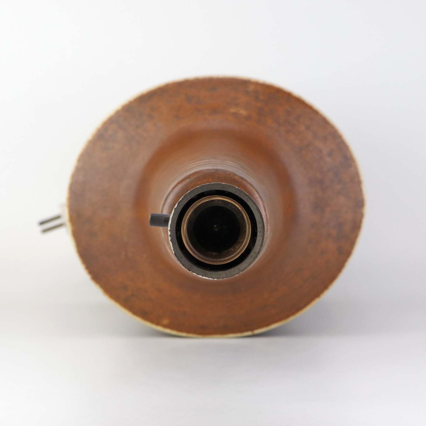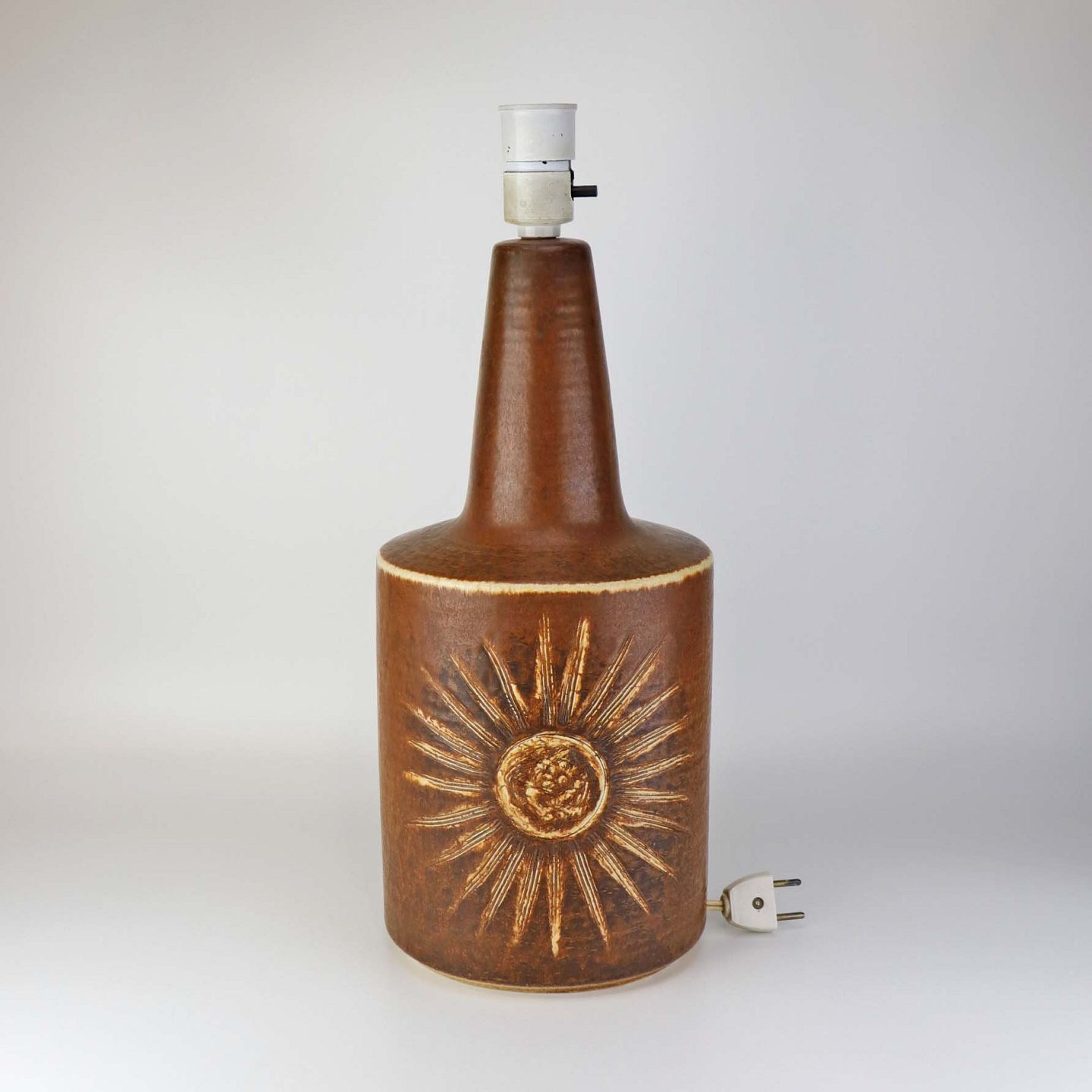 Lampefod i stentøj med gyldenbrun glasur og dekoration af sol. Ledningen er opbevaret i foden. Nr. 1203-4