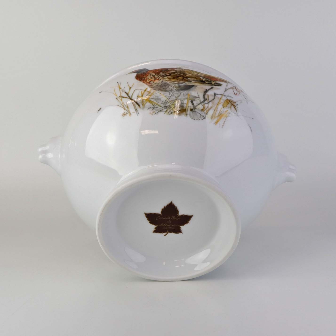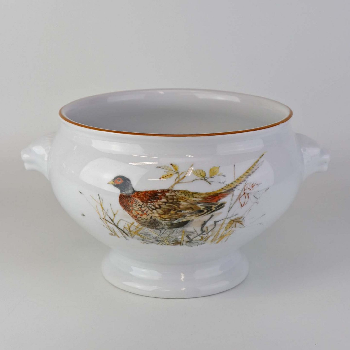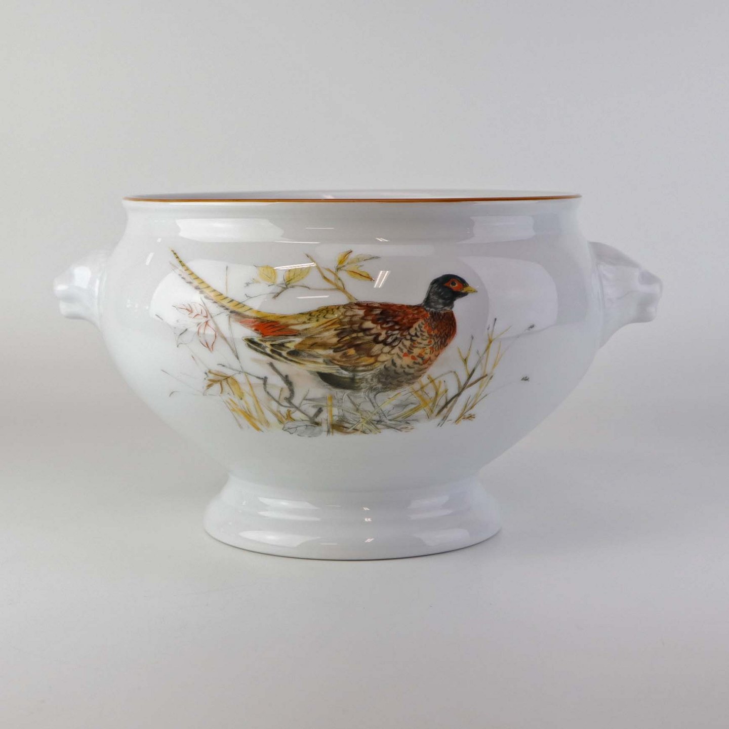 Rund skål på fod i porcelæn med hanke af grævlingehoveder og med motiv af fasan fra stellet Jagtstel. Nr. 2