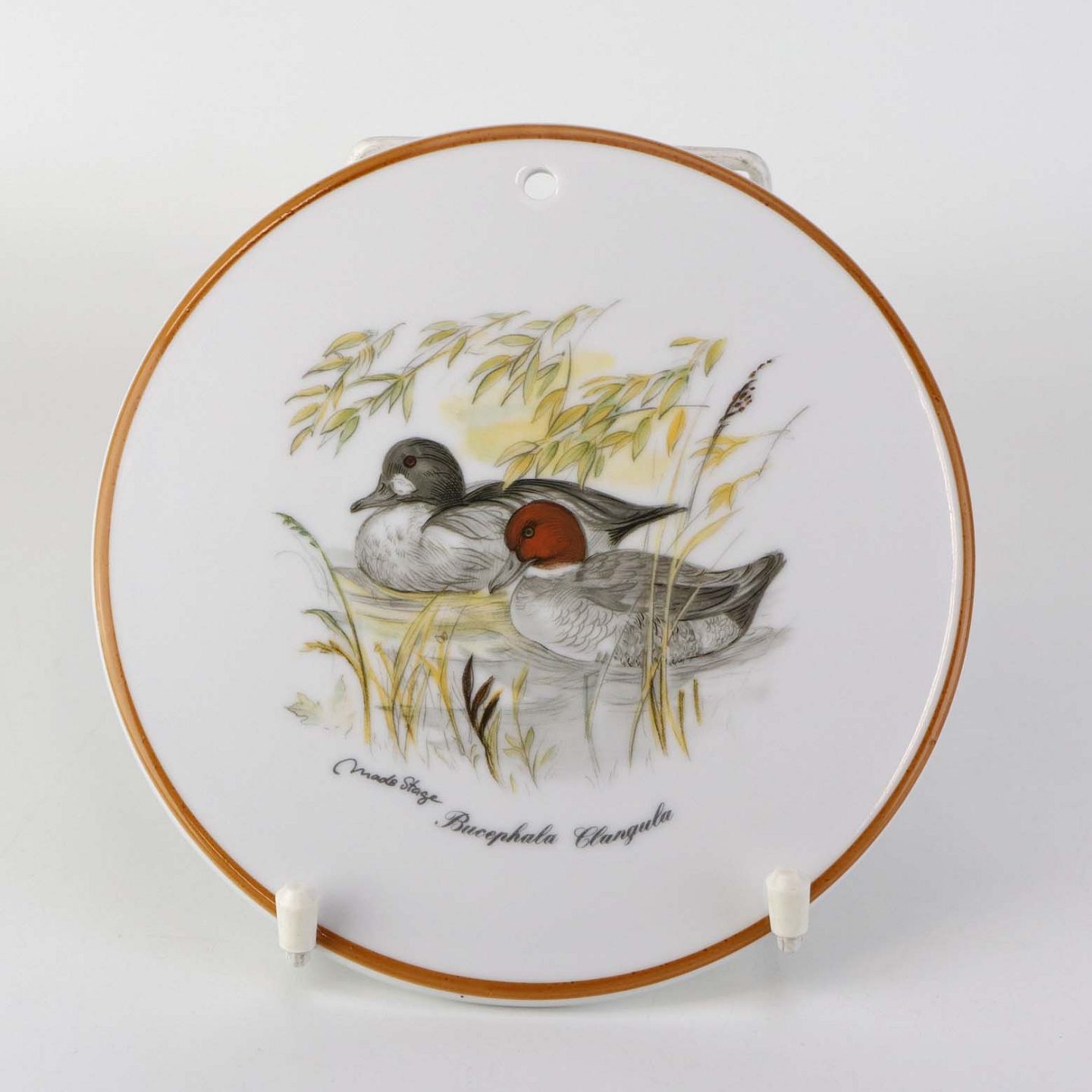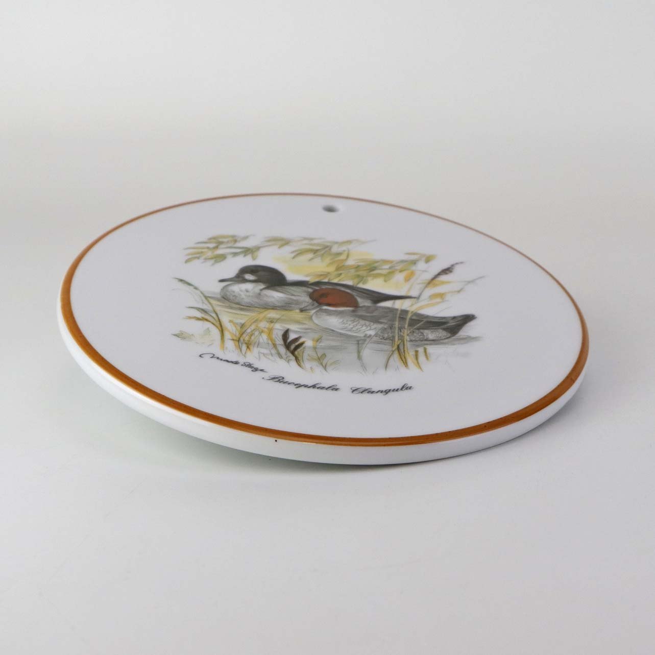 Rund smørbrik i porcelæn med forboret hul til ophæng og motiv af ænder fra stellet Jagtstel.