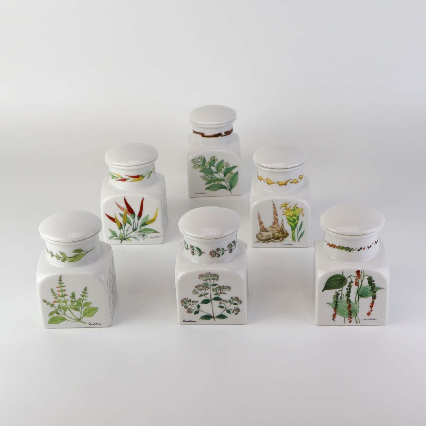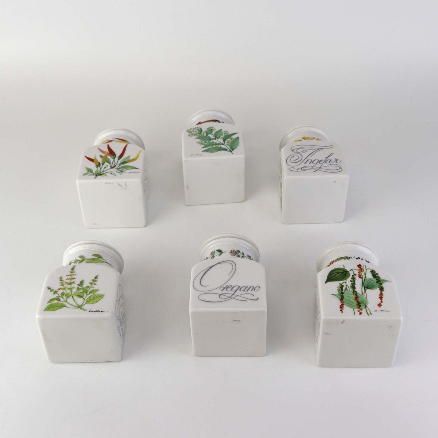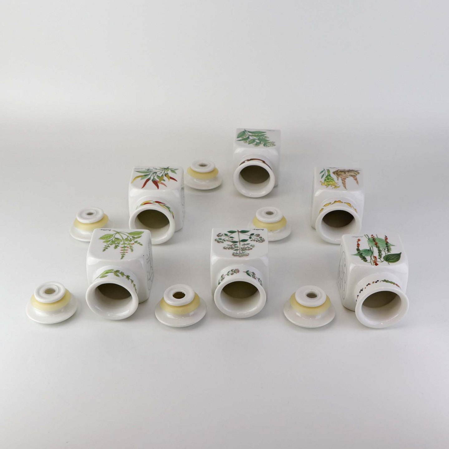 Text available in Danish: Forskellige krydderurte krukker i porcelæn med aftagelig top og gummiforsejling dekoreret med urtemotiv og tekst.