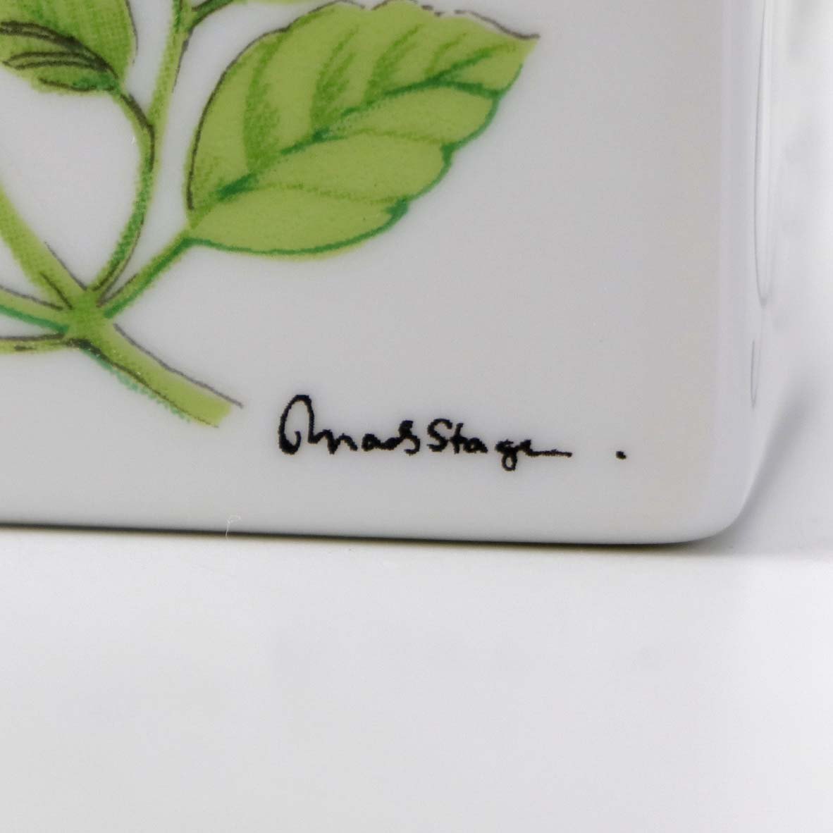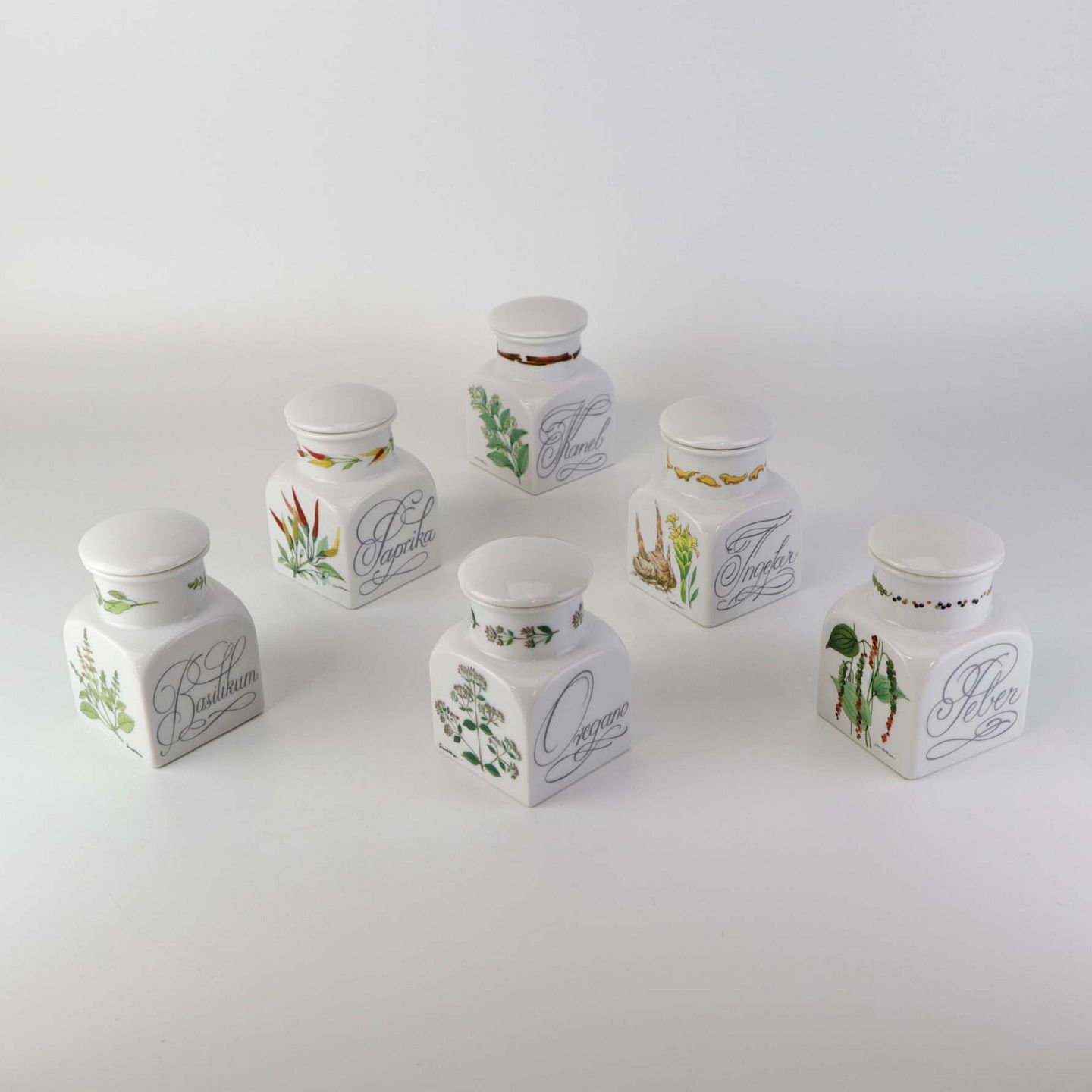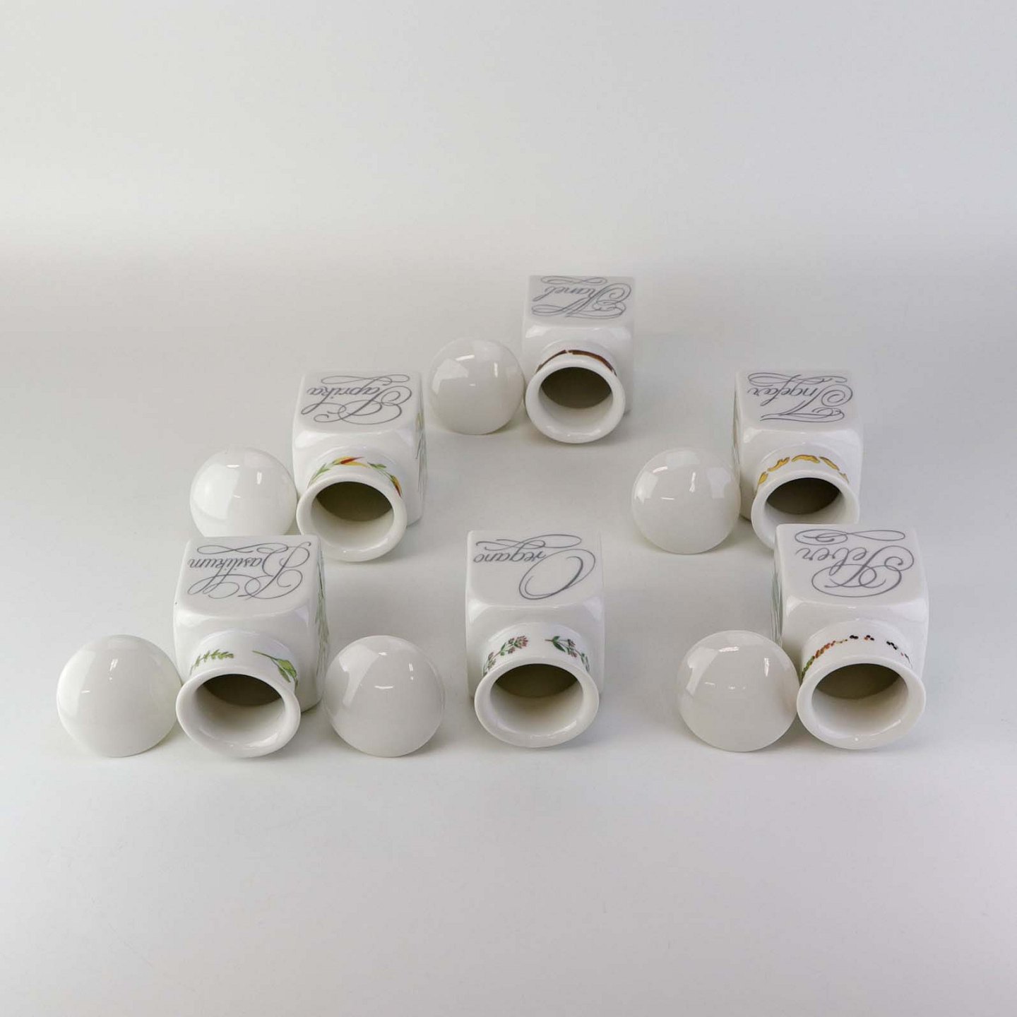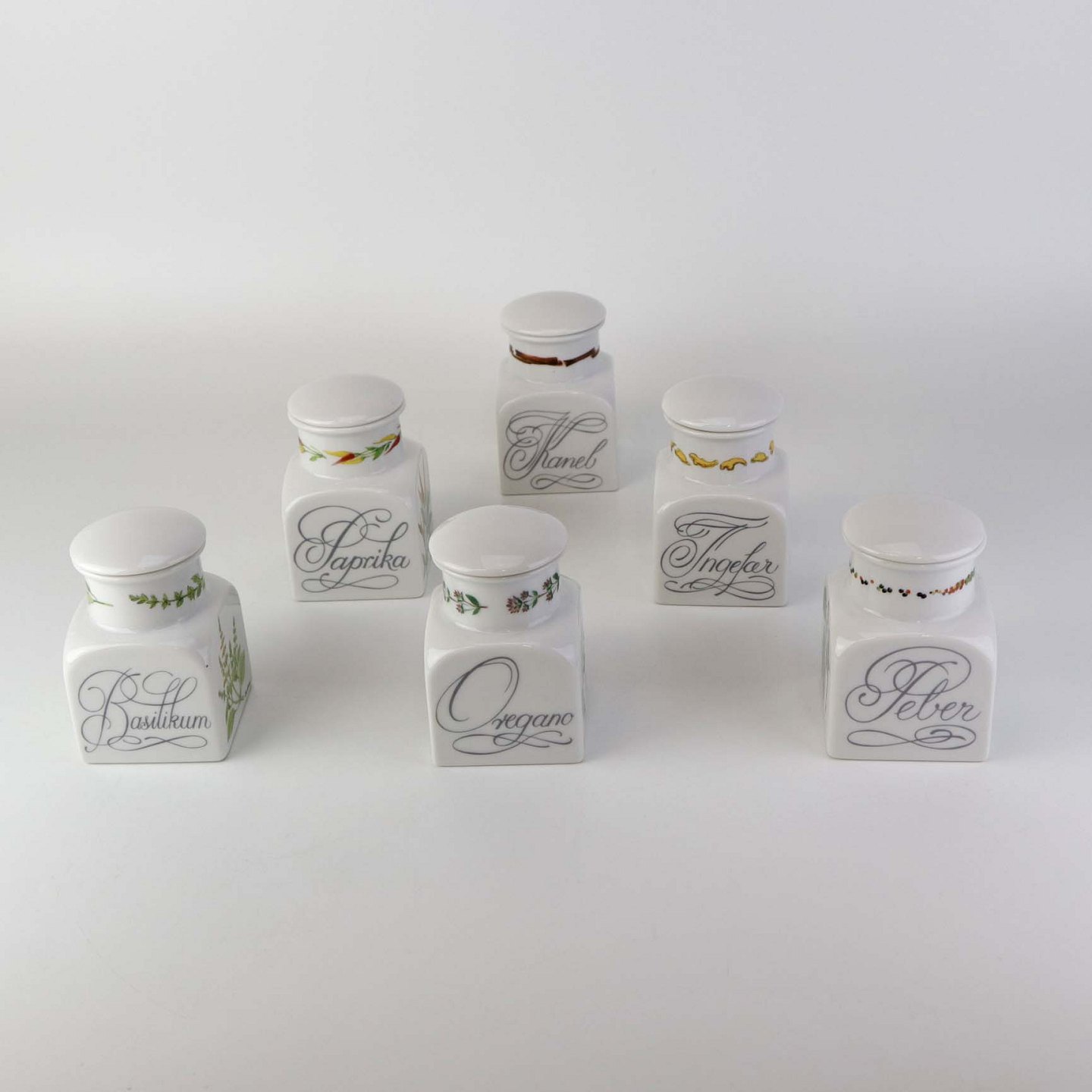 Text available in Danish: Forskellige krydderurte krukker i porcelæn med aftagelig top og gummiforsejling dekoreret med urtemotiv og tekst.
