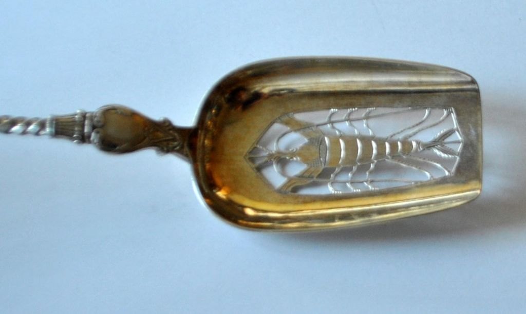 Krebse ske af sølv, København, 1869. Uidentificerbar mester stempel. Med byvåben og guardein mærke. Laf med krebs og indvendig forgyldning. Snoet skæft med englehoved. L: 22 cm.