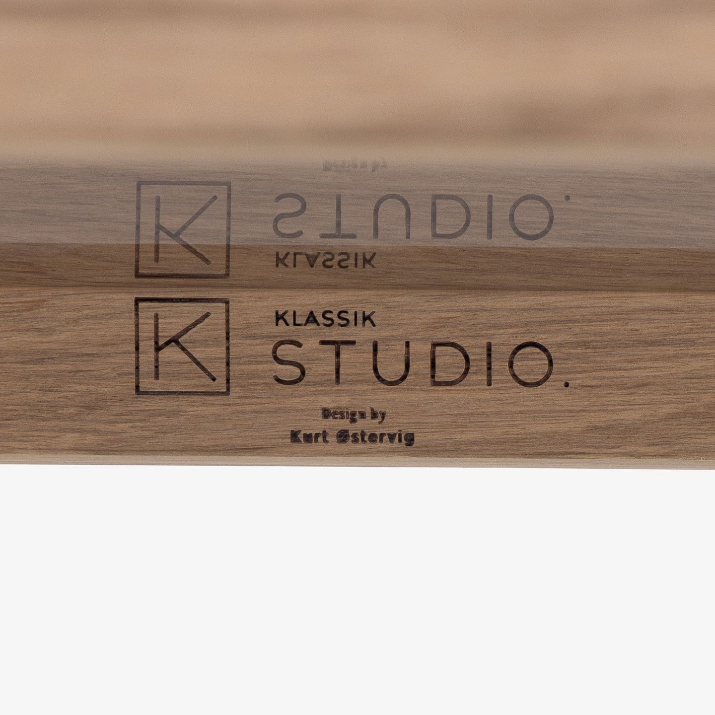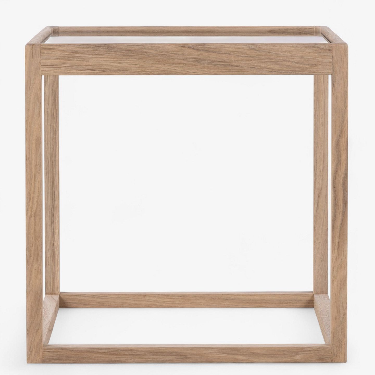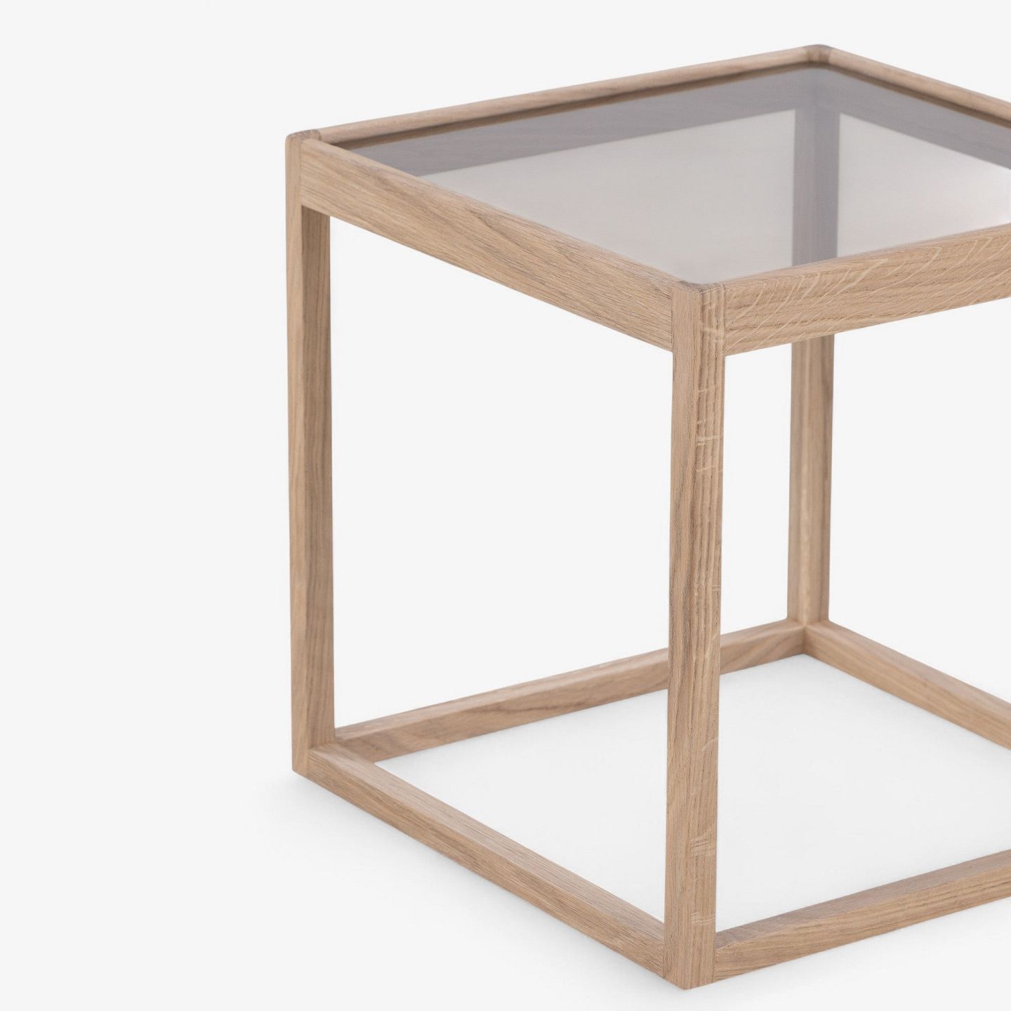 'Kubebord' med stel i lyst egetræ og røgfarvet glasplade.