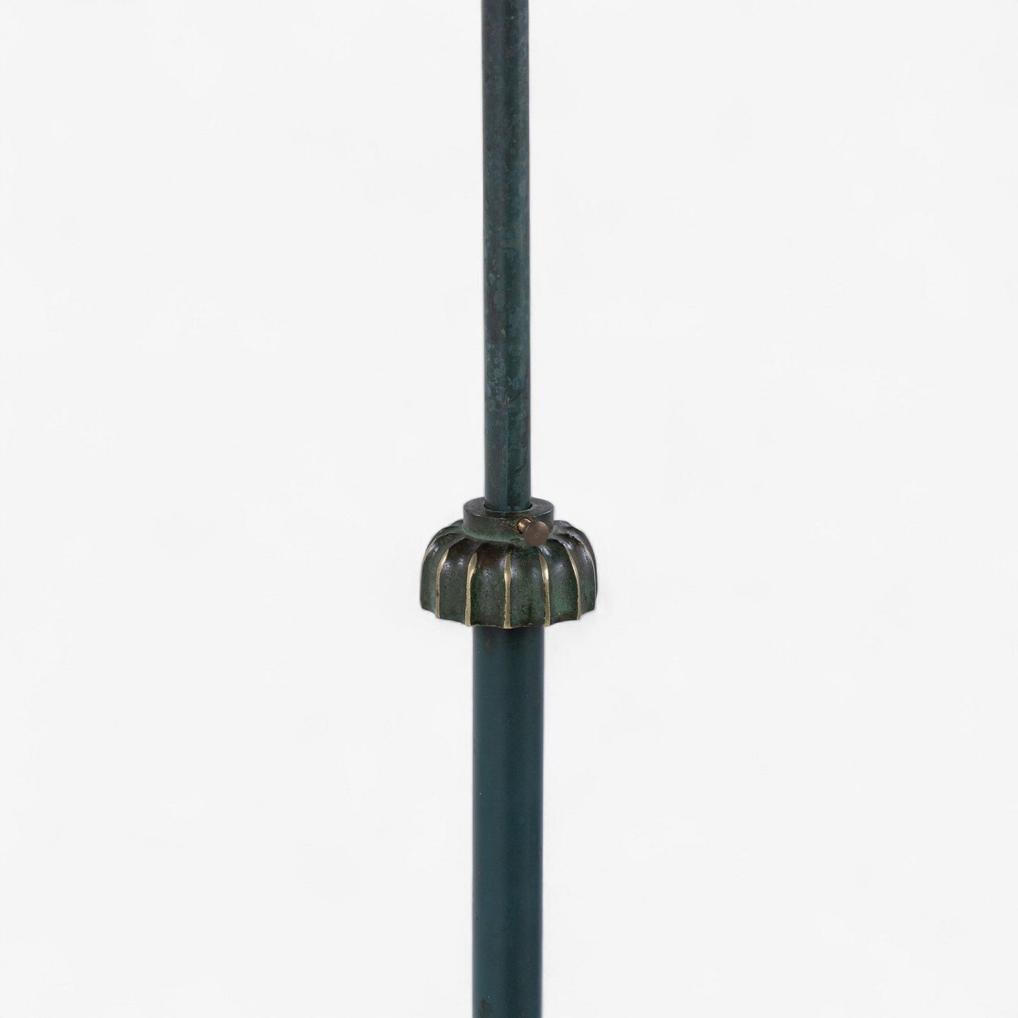 Skulpturel gulvlampe i patineret bronze med højdejustering og hvid stofskærm. Fra 1930.