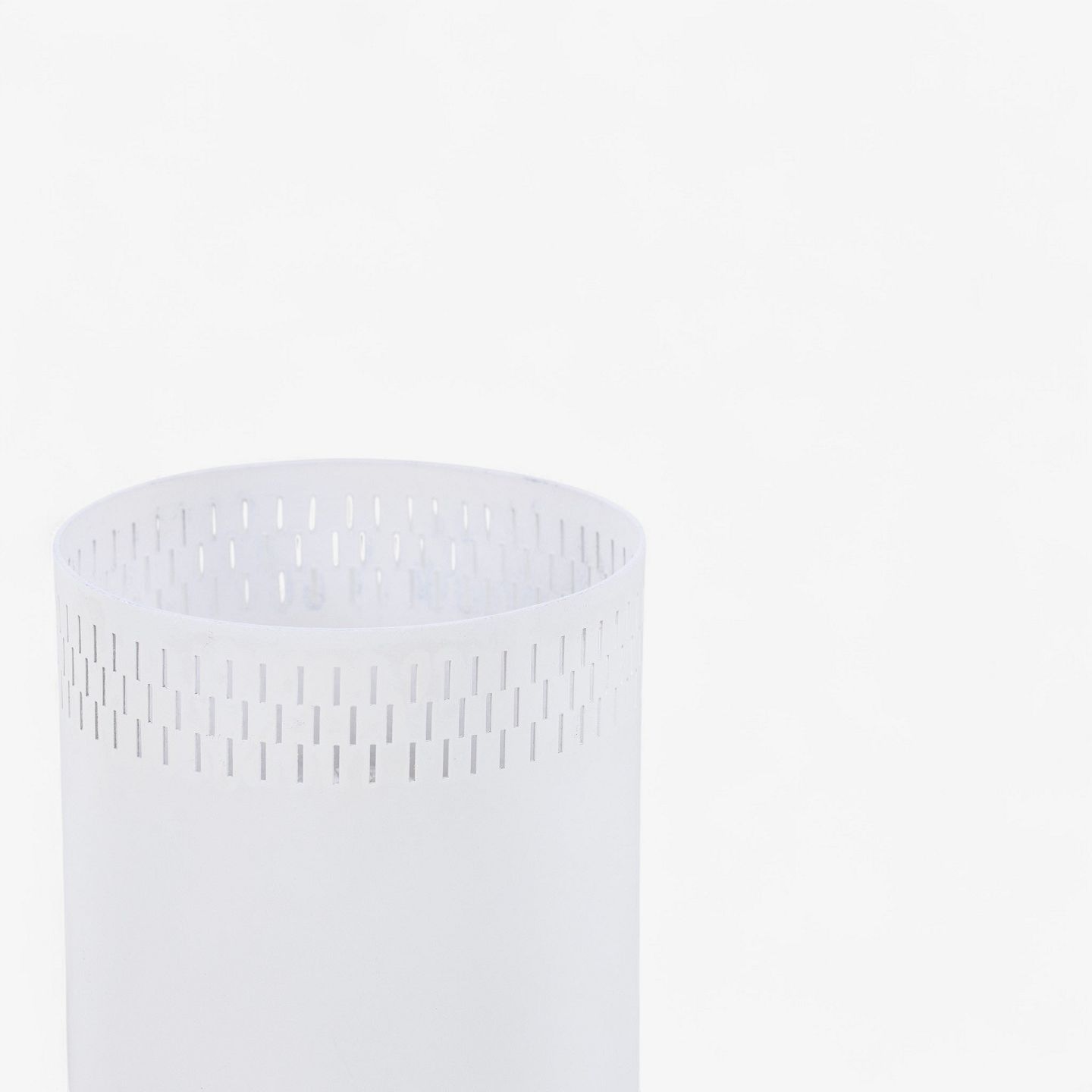 Cylindrisk formet bordlampe med base i patineret teak og skærm i hvidlakeret metal.