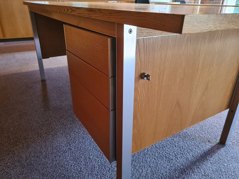 Stort Skrivebord fra 1980'erne i eg og aluminium. Fremstår pænt, velholdt og udmærket funktionsdygtigt. Dog med meget let afblegning på bordpladen efter en skrivemåtte. (Ses på billede)