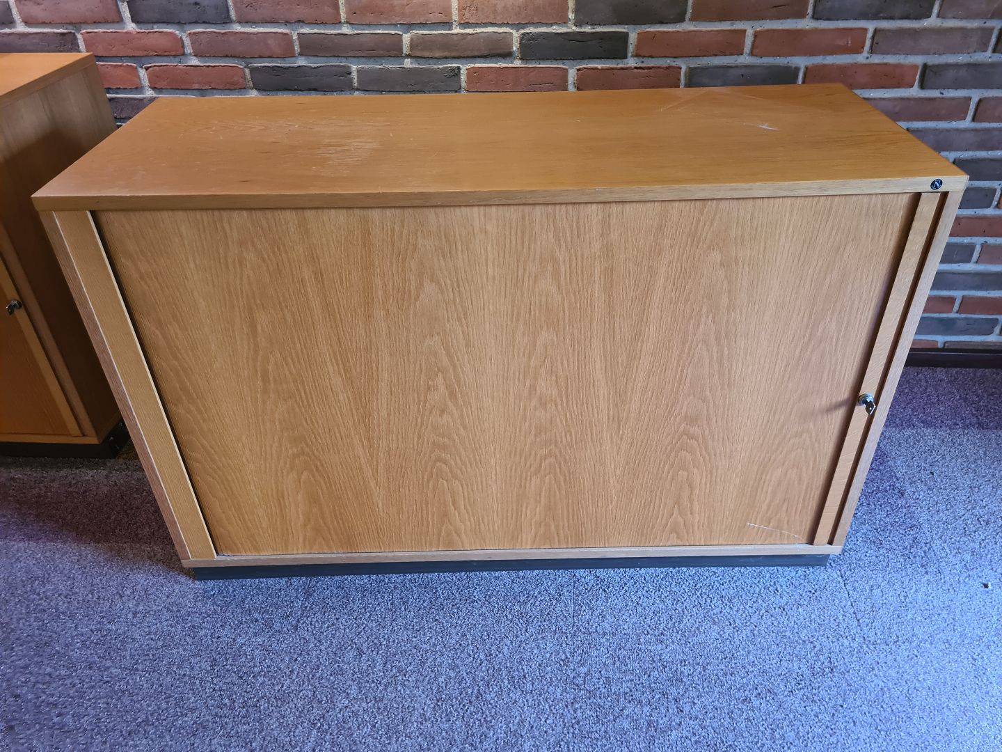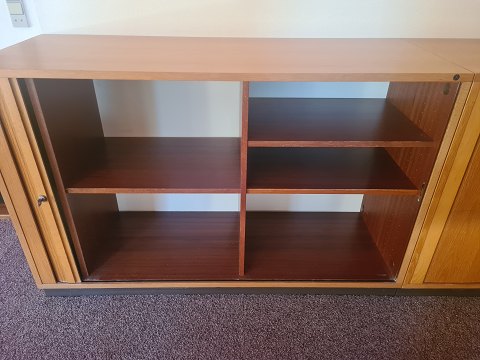Arkivskab fra 1980'erne i finéret eg med jalousi låge. Fremstår pænt og velholdt, dog med lettere brugsspor på toppen. (Billeder) Forskellige indretningsformer haves. (Billeder) Fungerende nøgle medfølger.