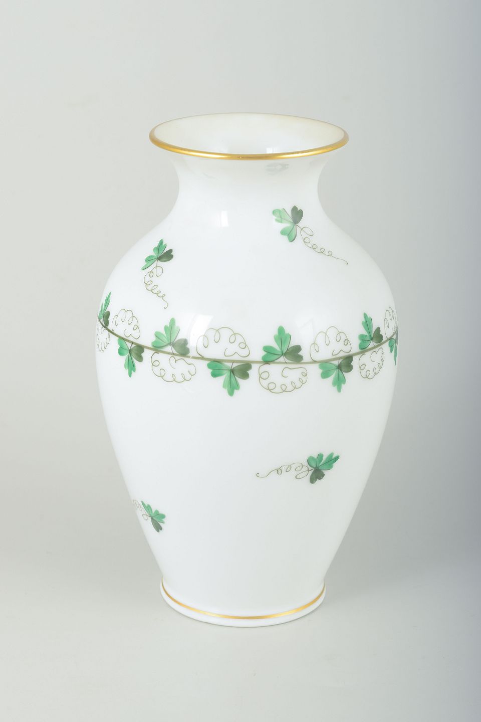 Elegant porcelæns­vase med håndmalet grønt bladdekor og fine detaljer i guld. Klassisk form med svungen korpus og afrundet fod, afsluttet med guldkant ved åbningen.