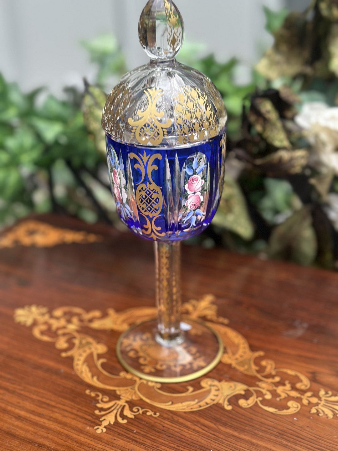 Bohemia krystalbæger med låg på lavet i overfangsglas , håndslebet blykrystal , emalje og guld , fra rokoko tide, fremstilling 1950-1970