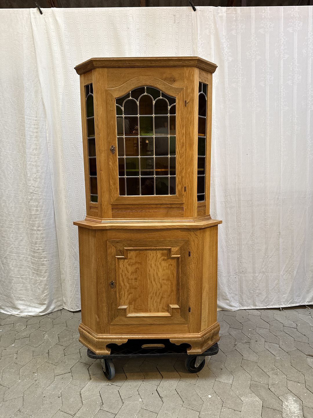 Hjørneskab i delvis massiv egetræ, fra 1980’erne