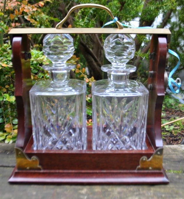 Tantalus med to karafler af krystal med propper. England. 19. årh. Mahogni. Messing håndtag og -beslag. Åbning ved håndtag med lås og nøgle. H: 32,5 cm. L: 29 cm.
