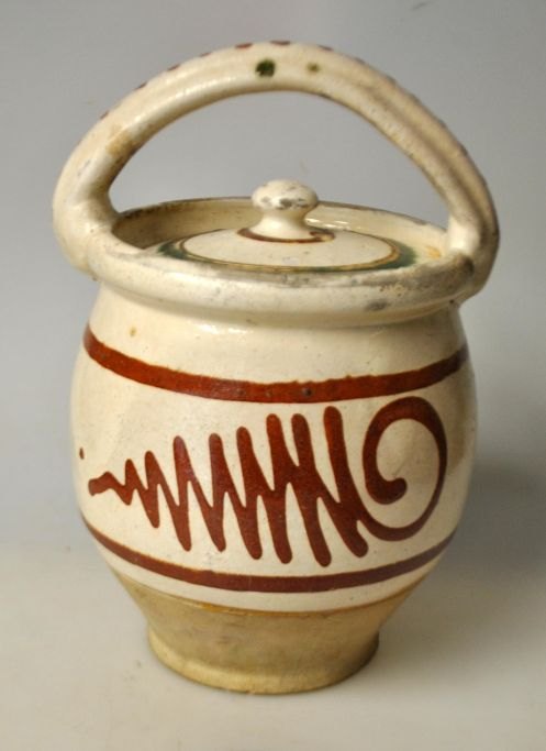 Antik dansk barselspotte i glaseret rødler, 19. årh. Med hvid underglasur og røde og grønne overglasurer. Med låg. H.: 21 cm.