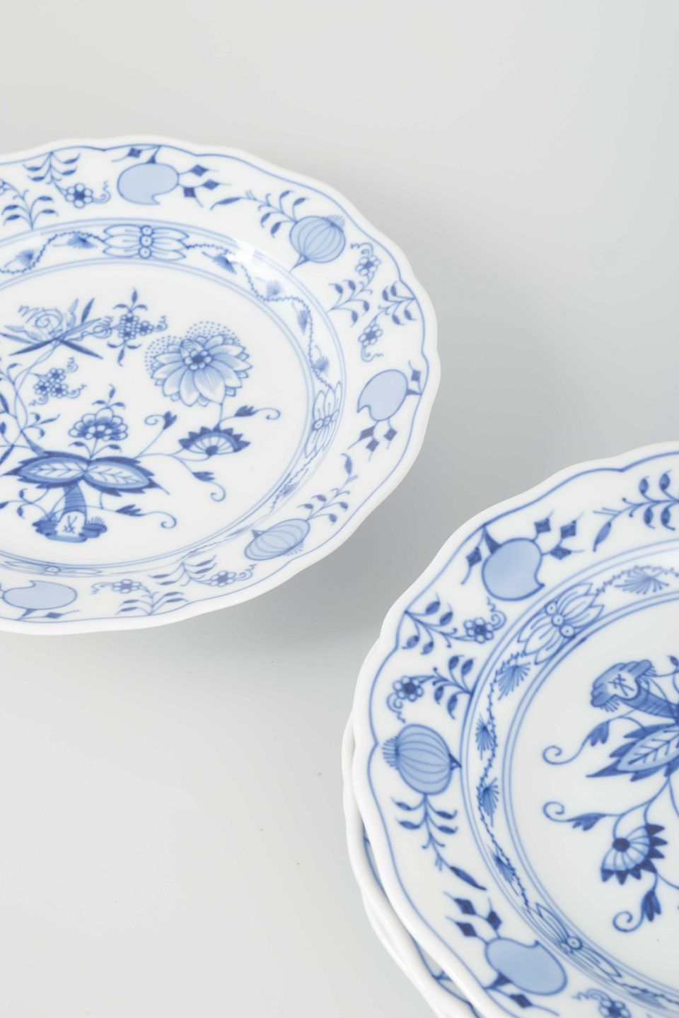 Fire håndmalede porcelænstallerkener i det klassiske “Løgmønstret” (Blue Onion) mønster. Dekoreret i underglasurblå med bølget kant og elegant ornamentik.