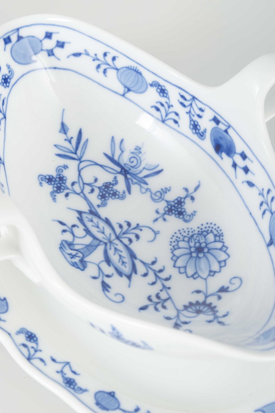 Elegant sovseskål i hvidt porcelæn med fastmonteret fad og dobbelt hældetud. Håndmalet underglasurdekoration i det klassiske “Løgmønstret” (Blue Onion) mønster.