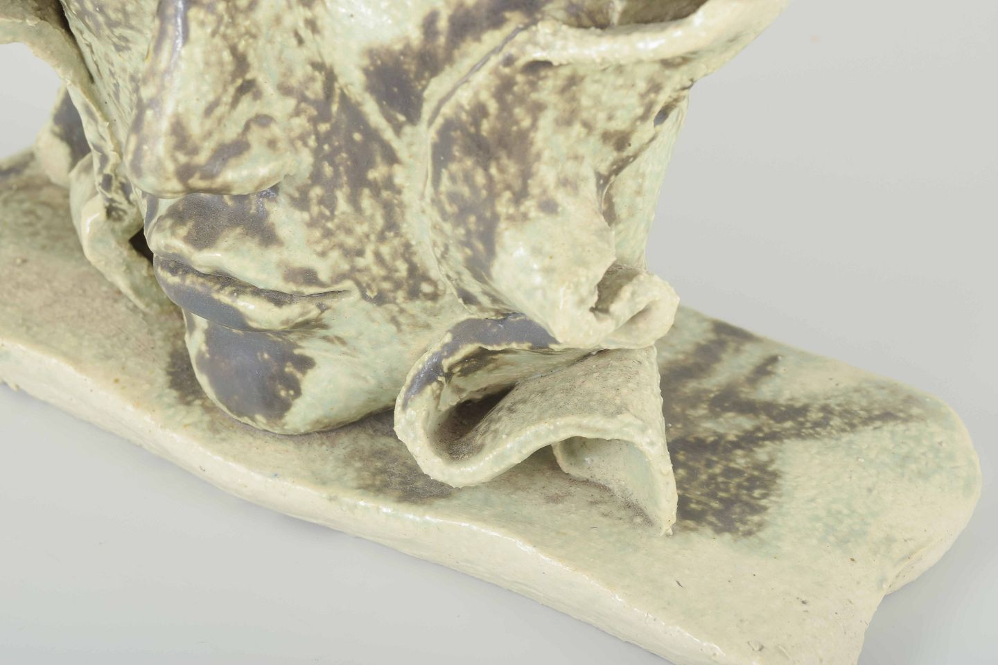 Unik håndformet hovedskulptur i stentøj med lys grønlig glasur og mørke kontraster. De bølgende, foldelignende former omkring ansigtet giver værket et ekspressivt og næsten surrealistisk udtryk. Signeret MH i leret.