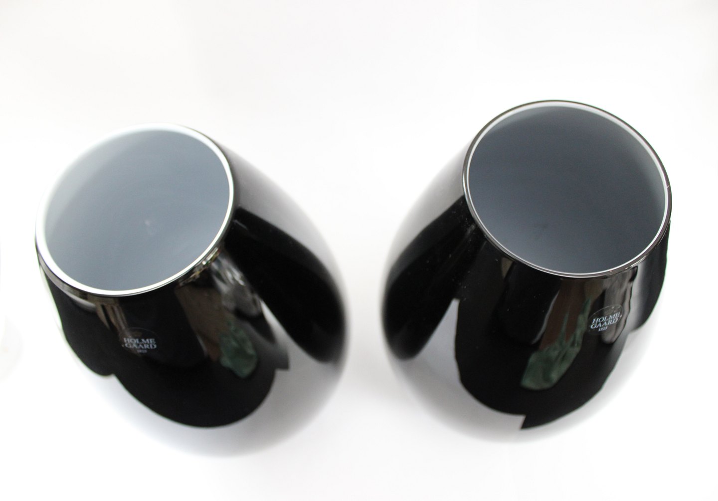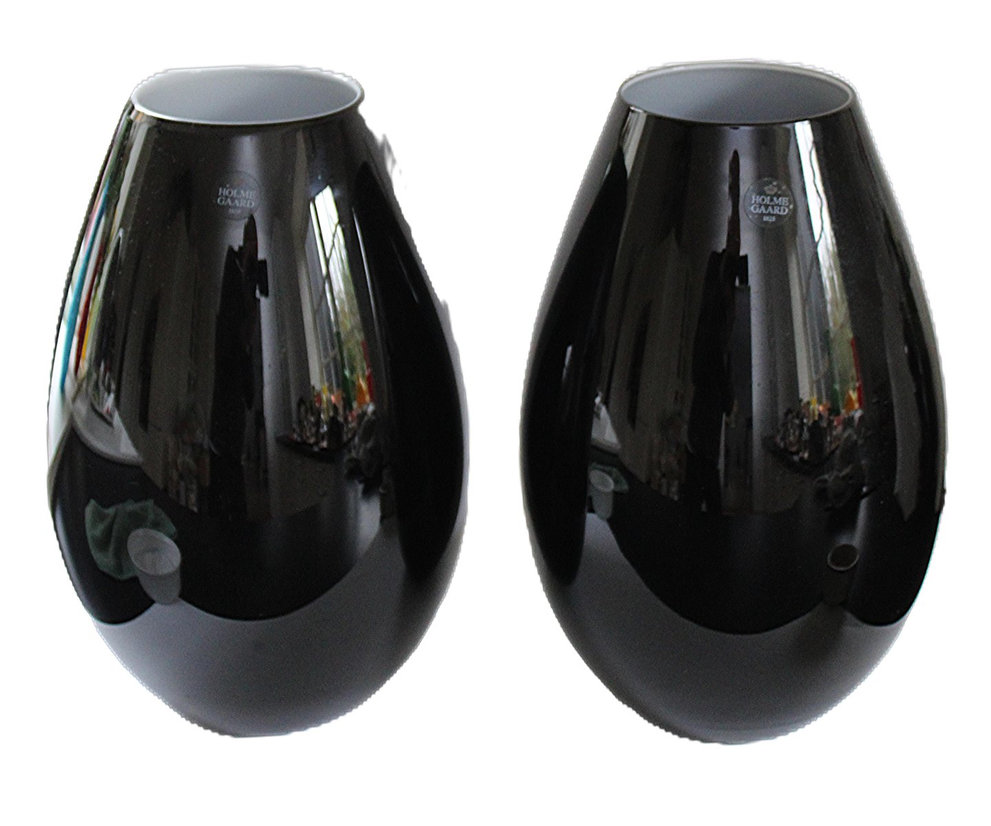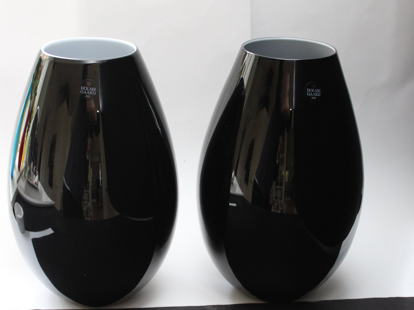 Holmegaard, Cocoon stor vase i sort glas udvendig med hvid glas indvendig. Designet af Peter Svarrer i 2005. Største vase. Højde 26 cm. Øverste diameter 9 cm. Trykt signatur og Holmegaard label. Den ene er tungere og mere hvid indvendig, den har også nogle brugsridser udvendig, gør venligst opmærksom på hvilken der ønskes.