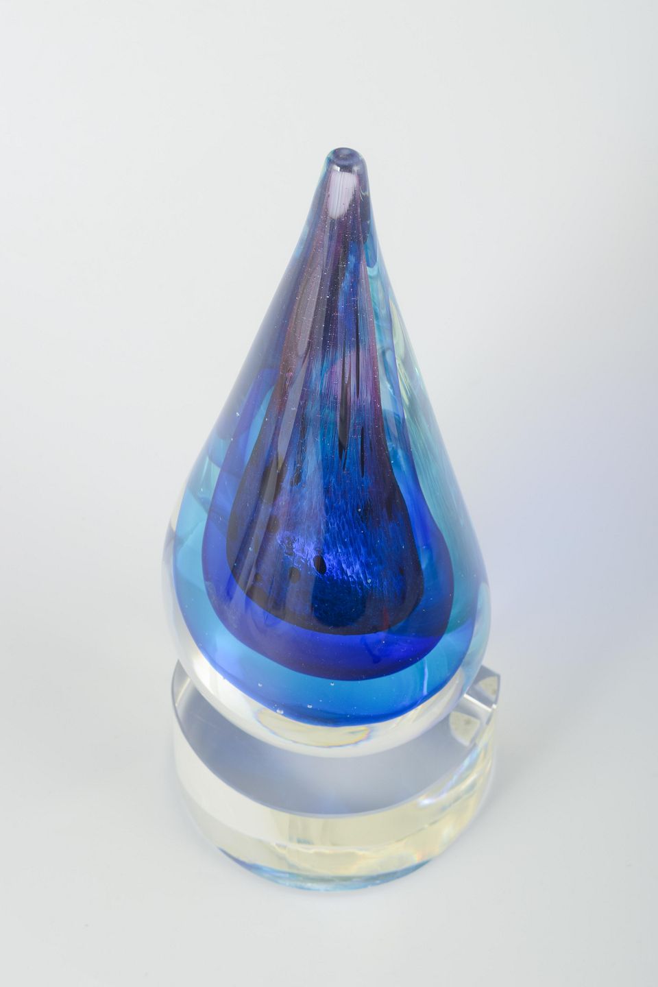 Håndlavet skulptur i klart og blåviolet glas, formet som en dråbe med optiske lag og elegant spids top. Monteret på rund fod i klart glas.