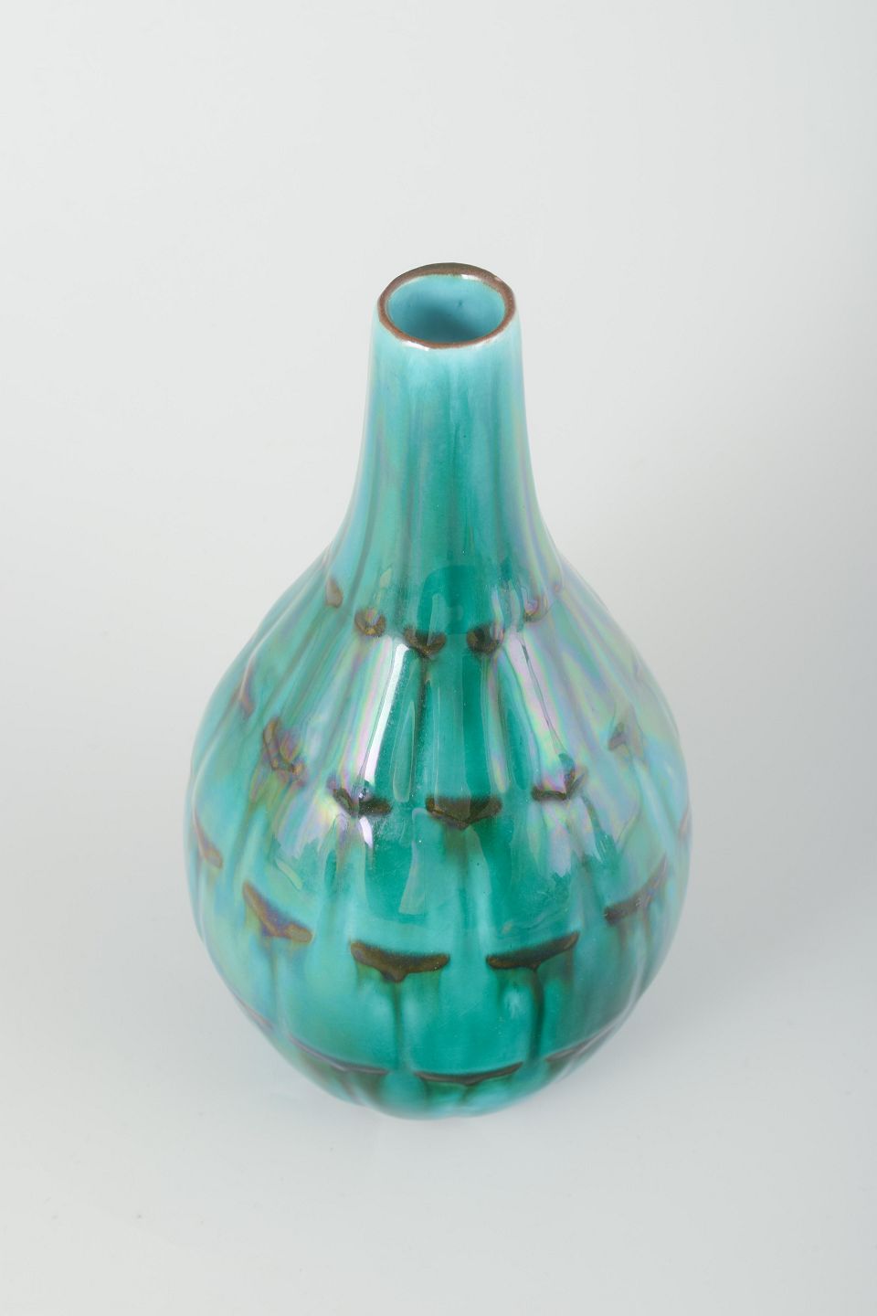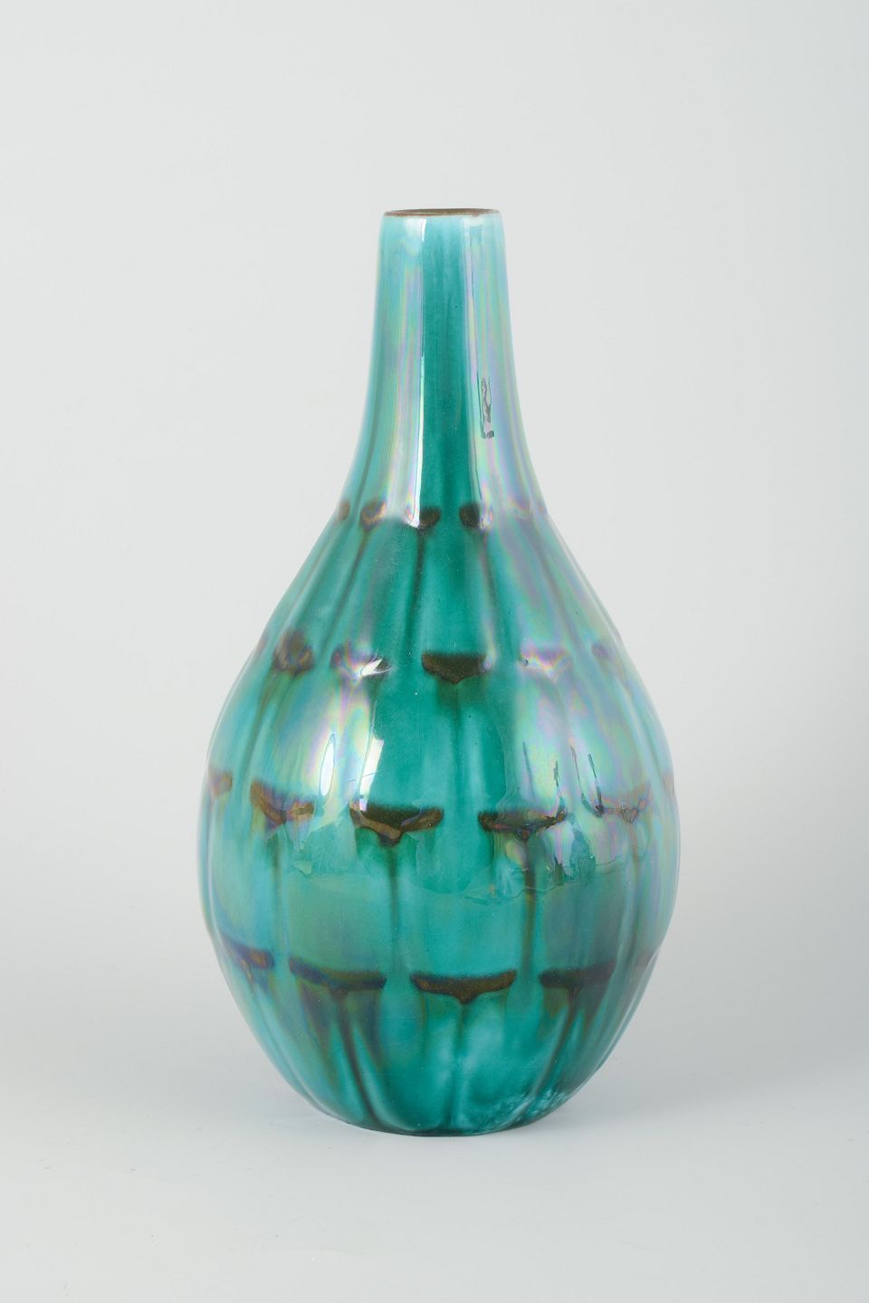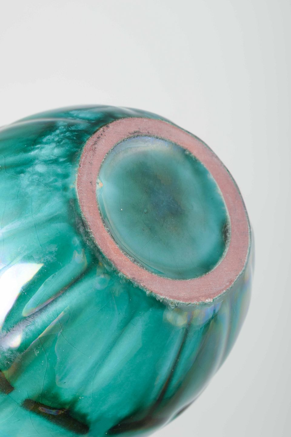 Dråbeformet vase i stentøj med blank turkisgrøn glasur og dekorative lodrette strøg i brunlige nuancer.