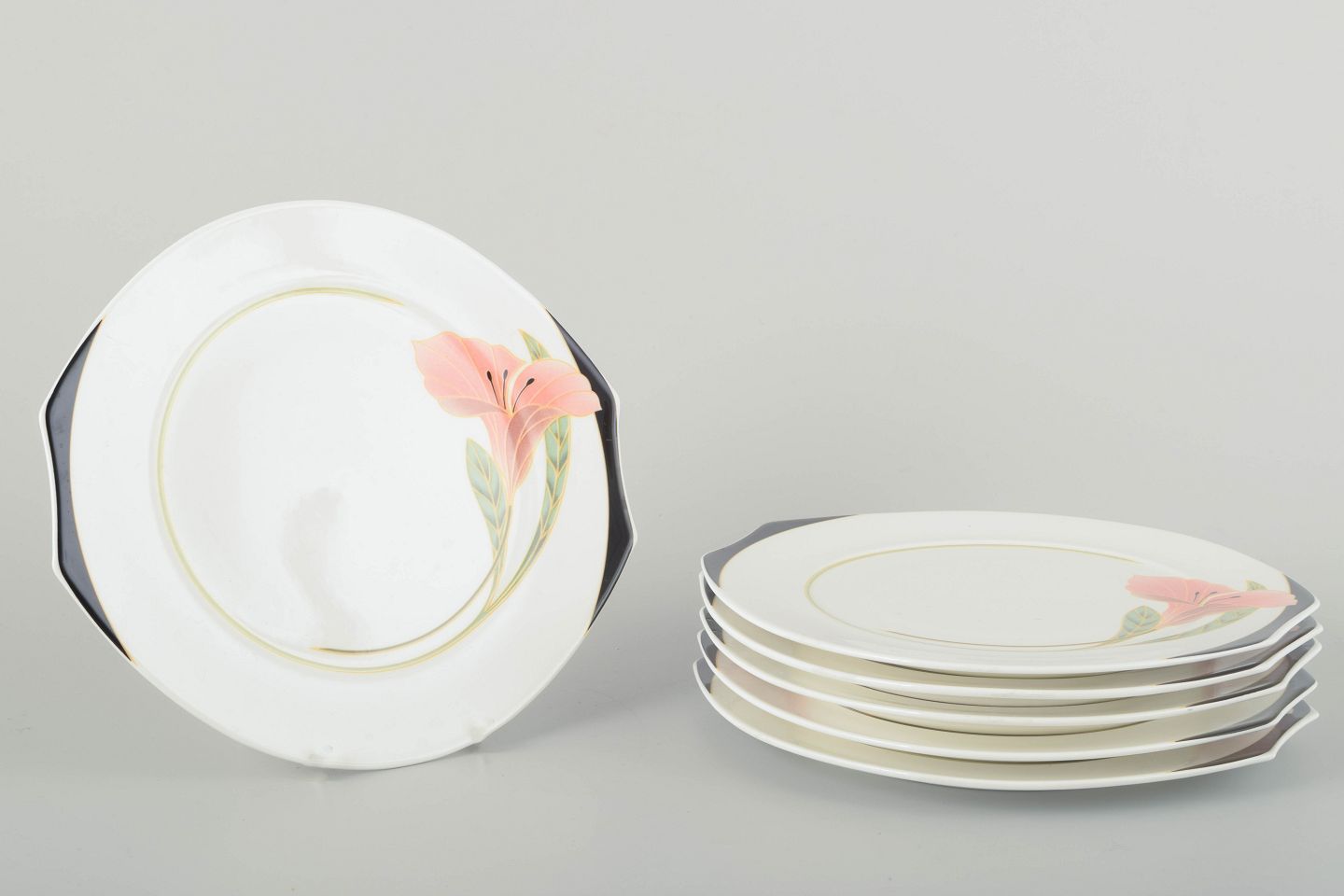 Seks porcelænstallerkener med håndmalet blomsterdekoration i rosa, grønne og sorte nuancer. Serien kombinerer bløde linjer og let asymmetriske detaljer med et elegant postmodernistisk formsprog.