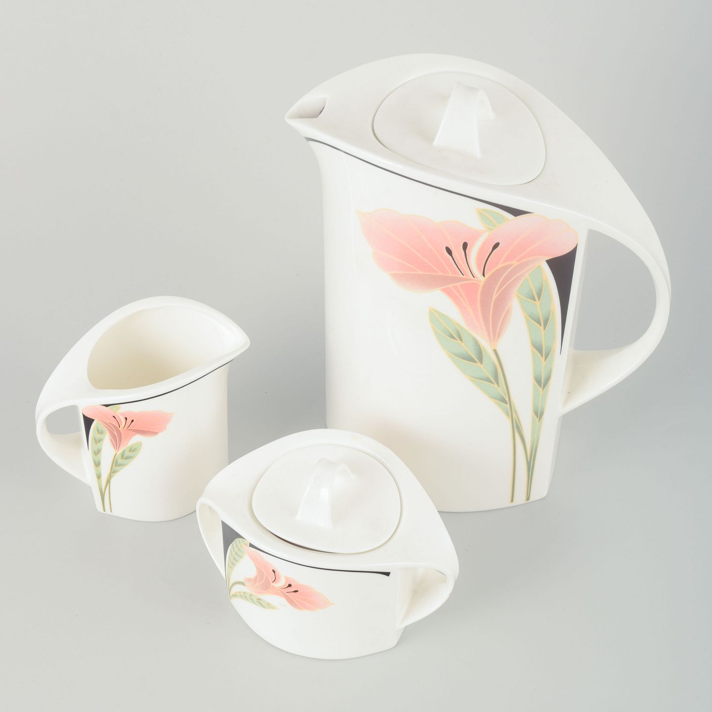 Porcelænskaffekande, sukkerskål og flødekande med elegant blomsterdekoration i rosa, grønne og sorte nuancer. Designet er karakteriseret ved bløde, buede linjer og et stilrent, postmodernistisk udtryk typisk for perioden.