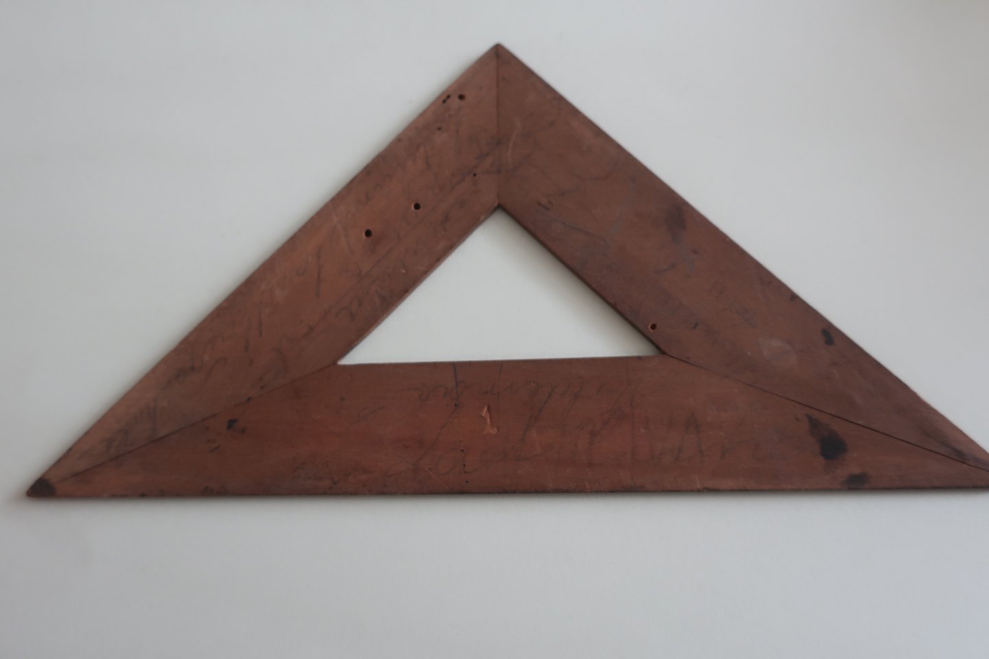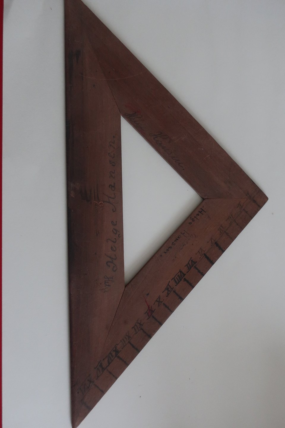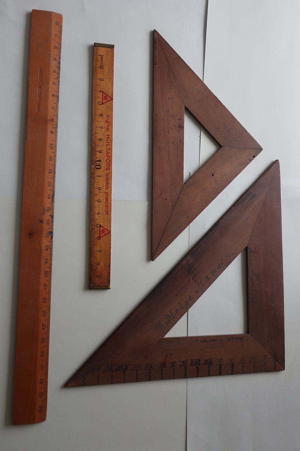 2 vinkler/trekanter (en lille og en stor) og 2 linealer i 2 størrelser