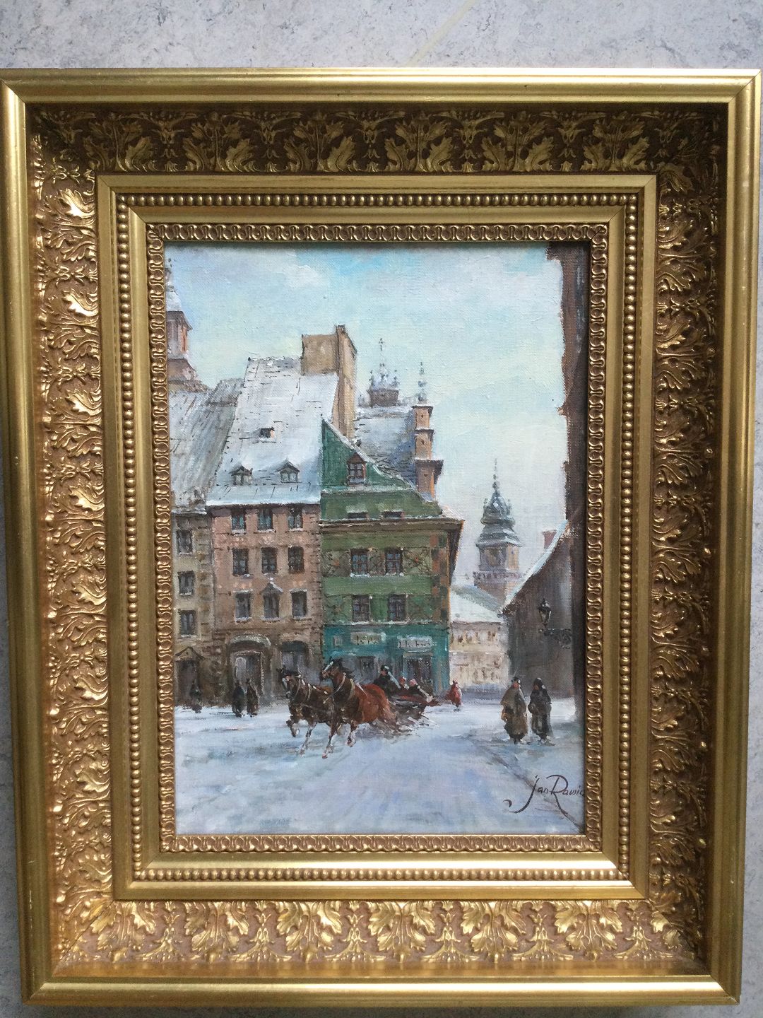 Maleri af Jan Rawicz - Vinterparti fra polsk by.