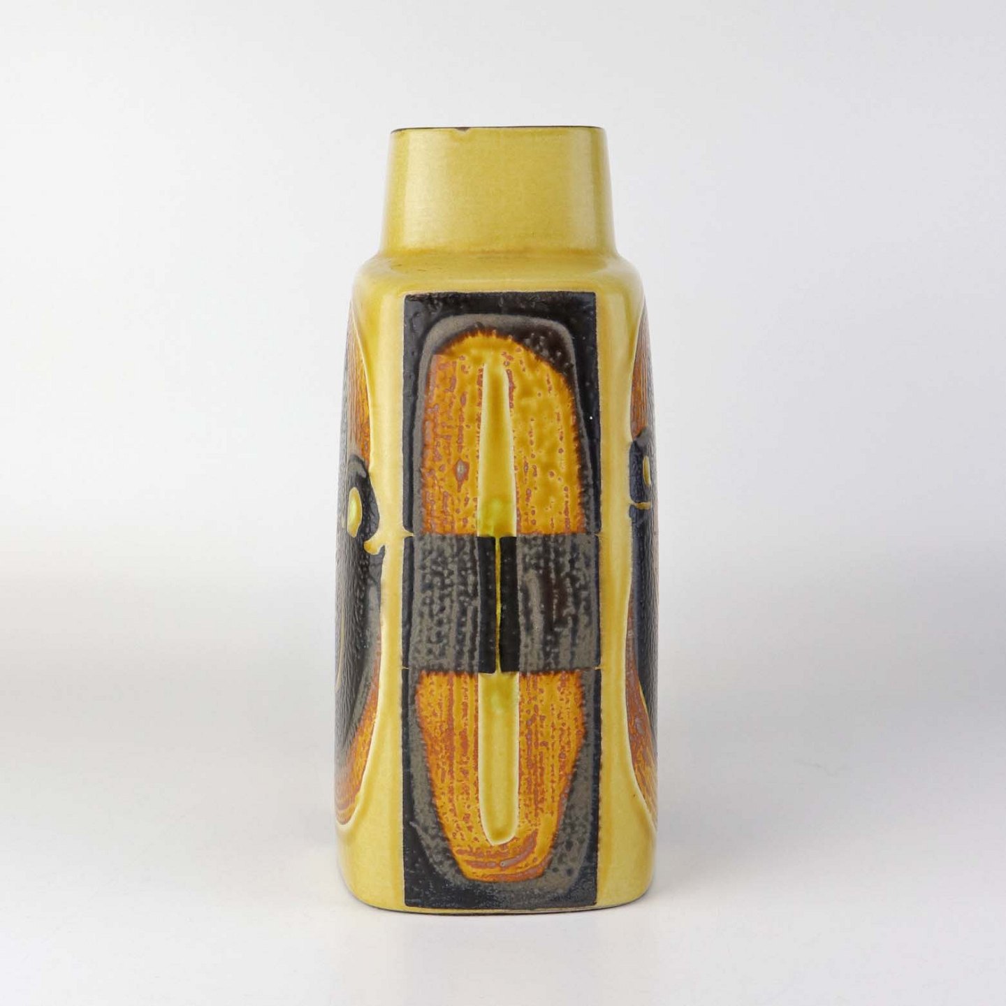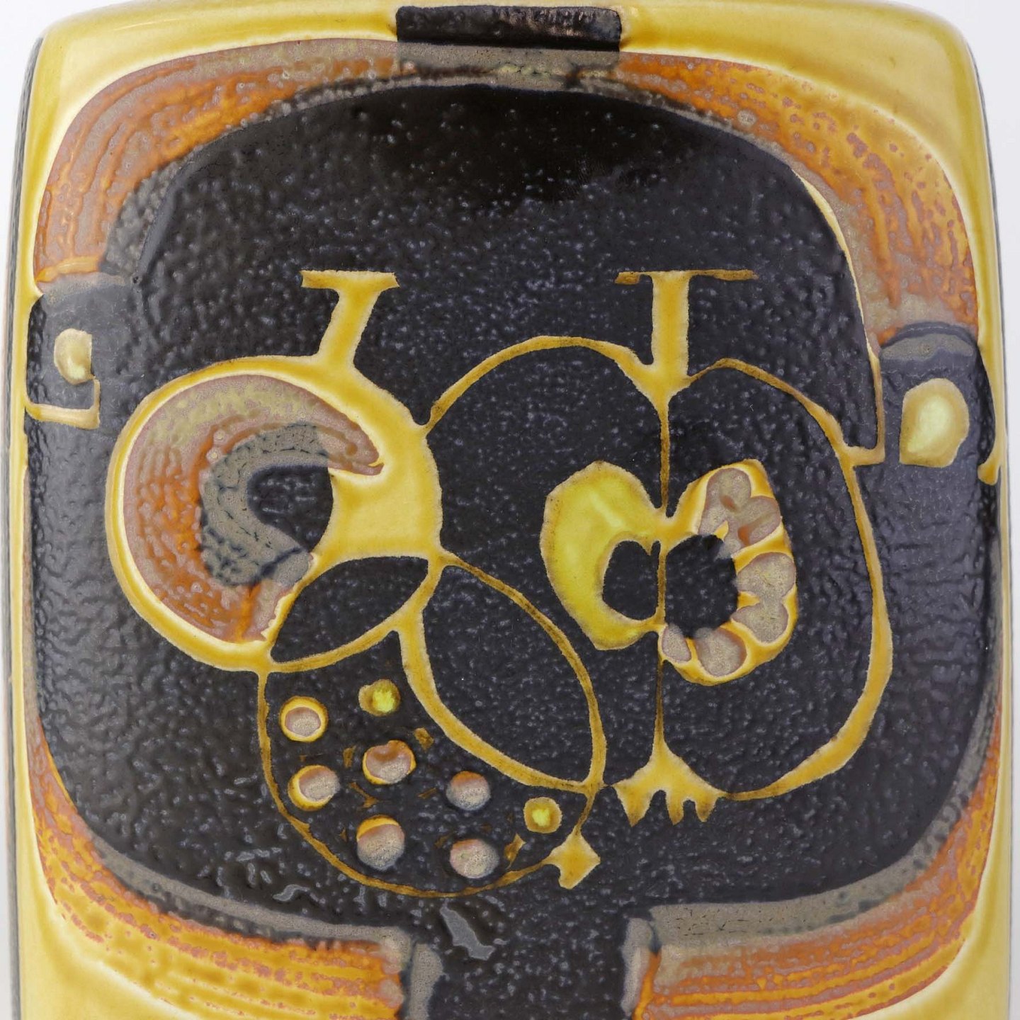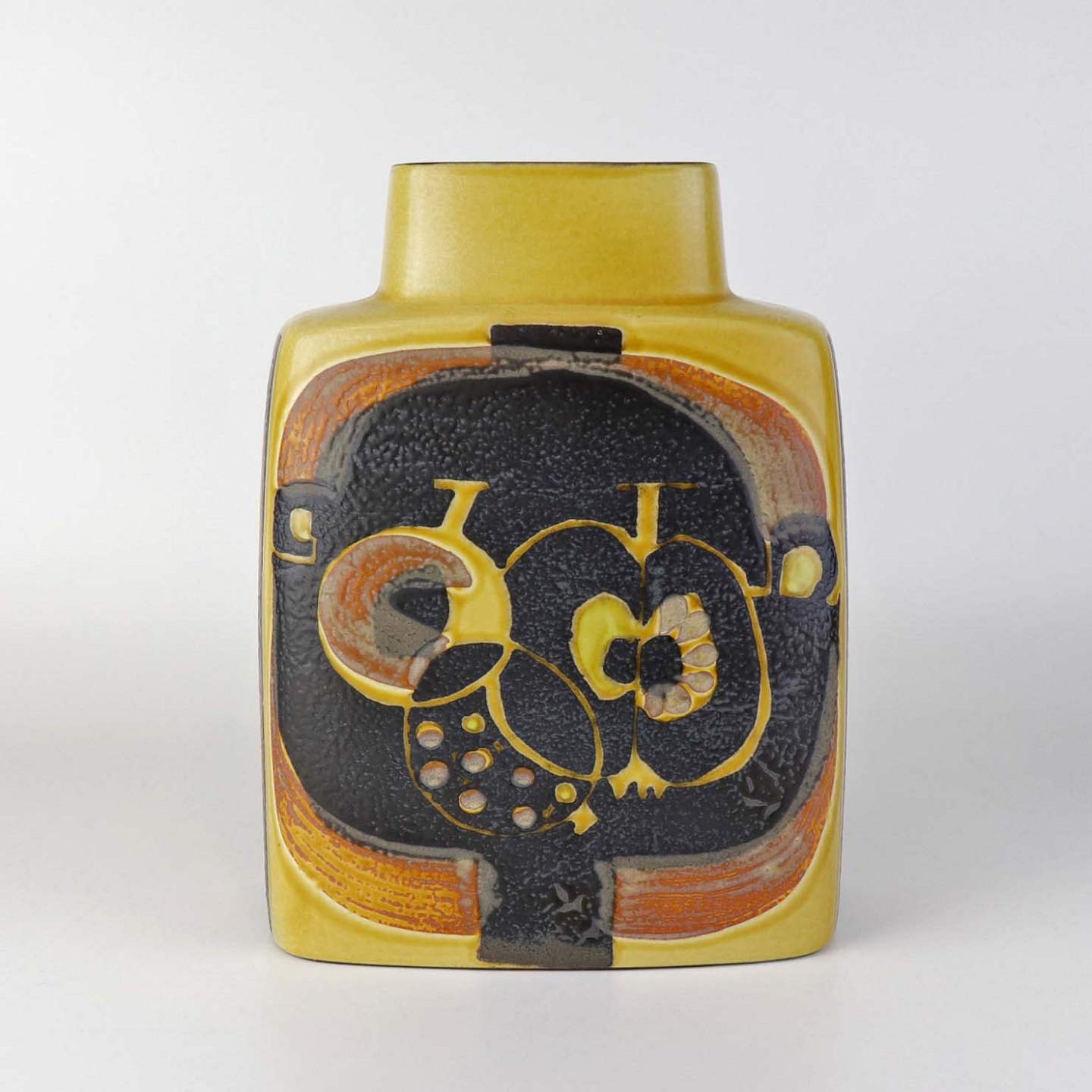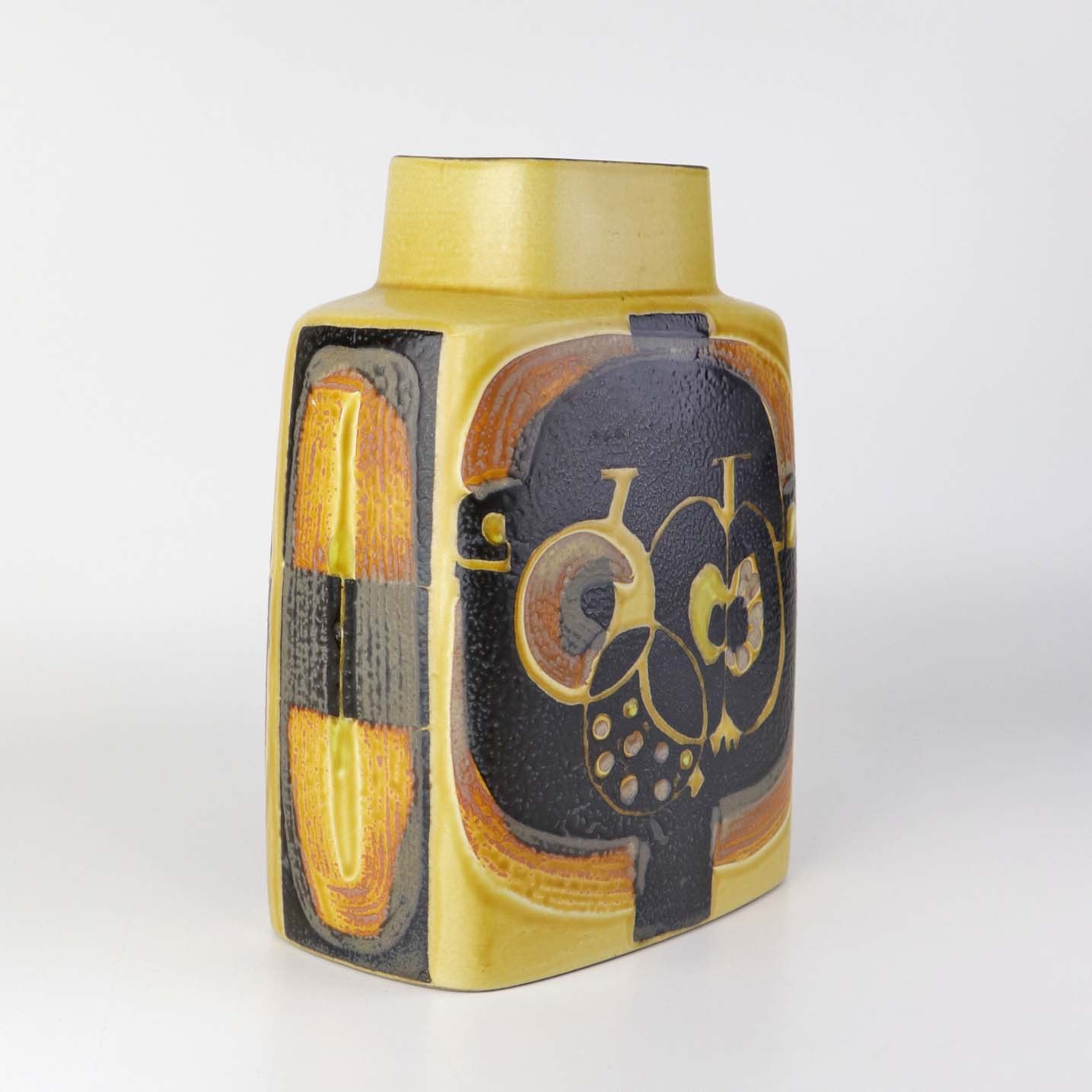 Kantet vase i fajance fra Baca serien i brune og gule farver med motiv af frugter. Nr. 792/3121