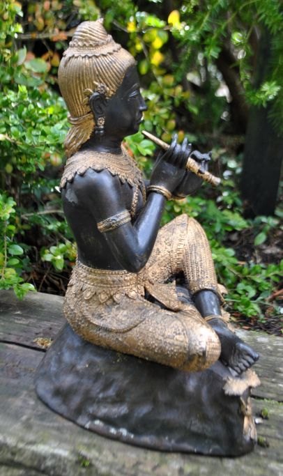 Fløjtespillende tempelmand i delvist forgyldt bronze, 20. årh.