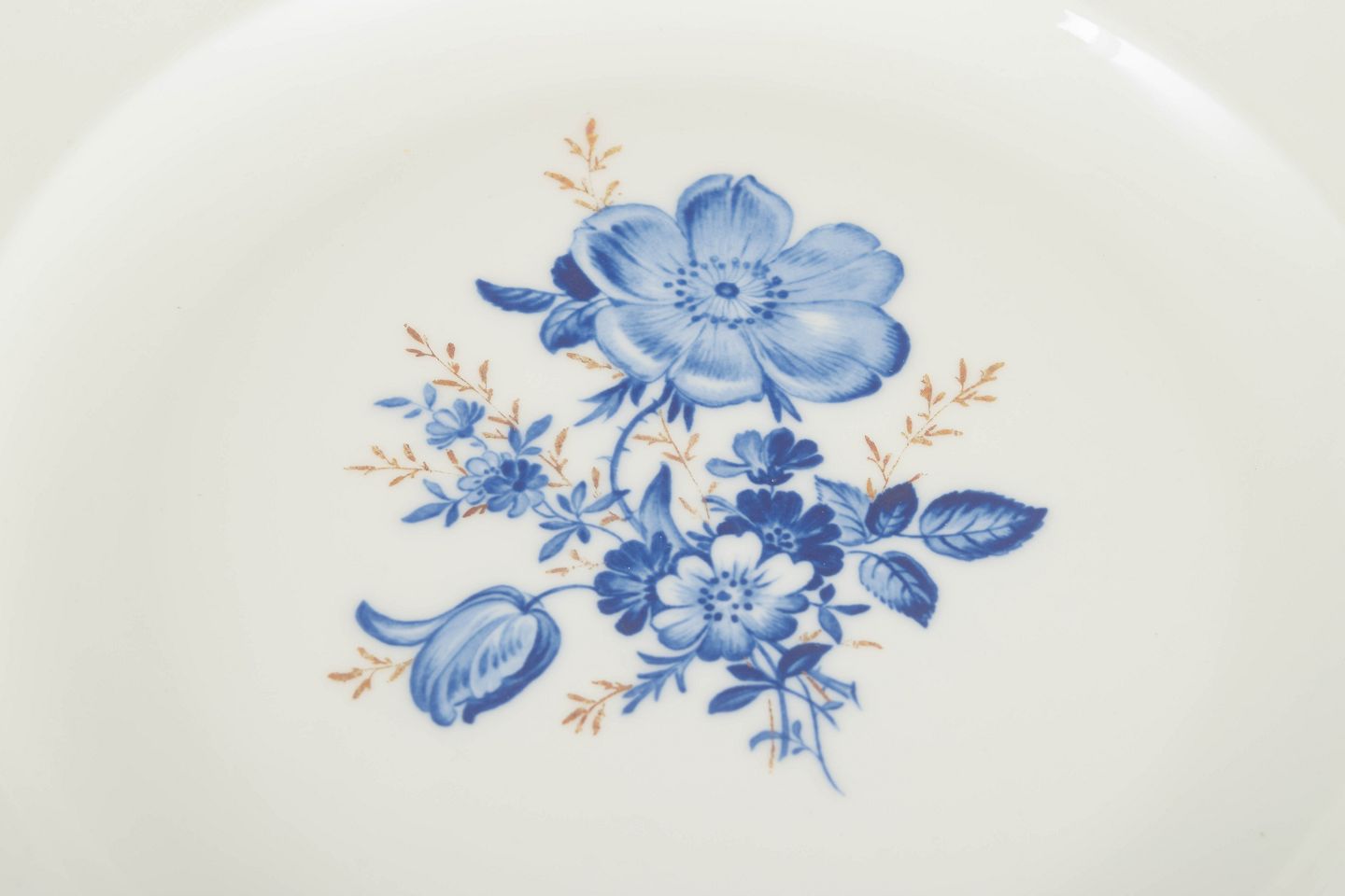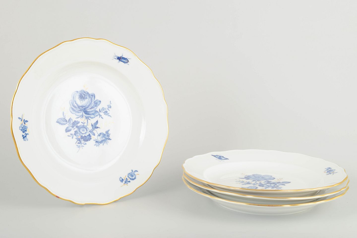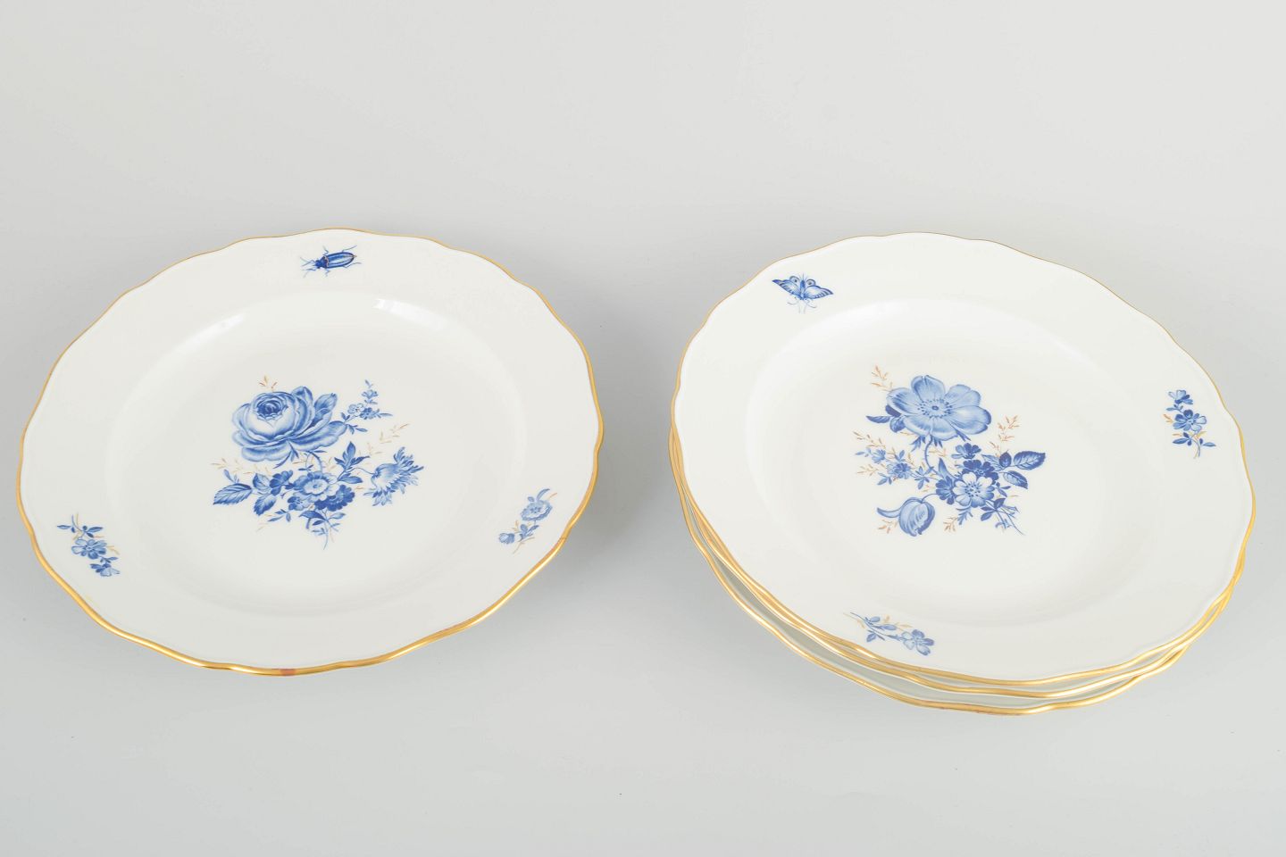 Hånddekoreret porcelæn med håndmalede blå blomsterdekorationer og forgyldte stafferinger langs kanten. Klassisk let bølget form.