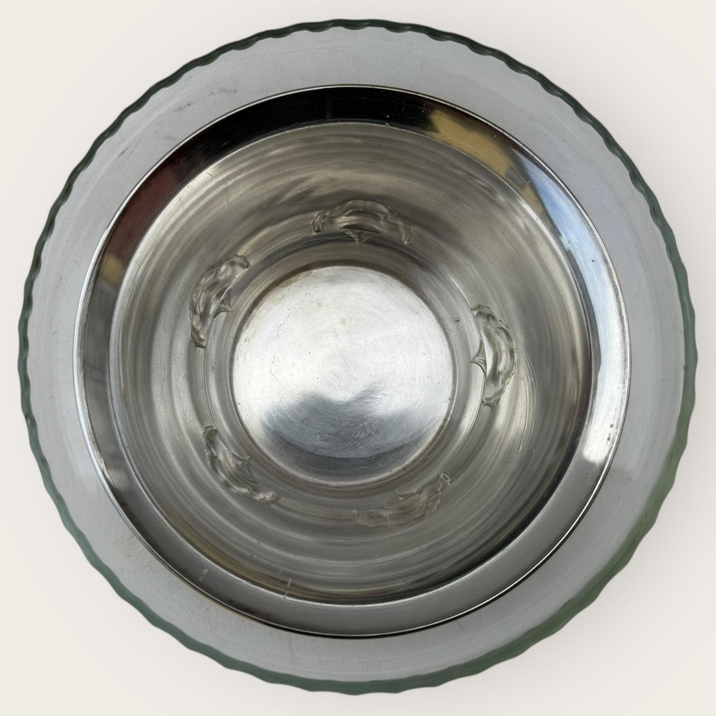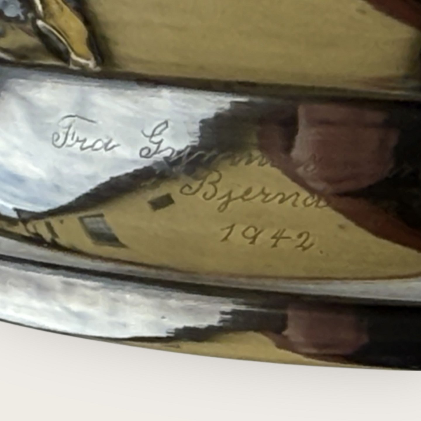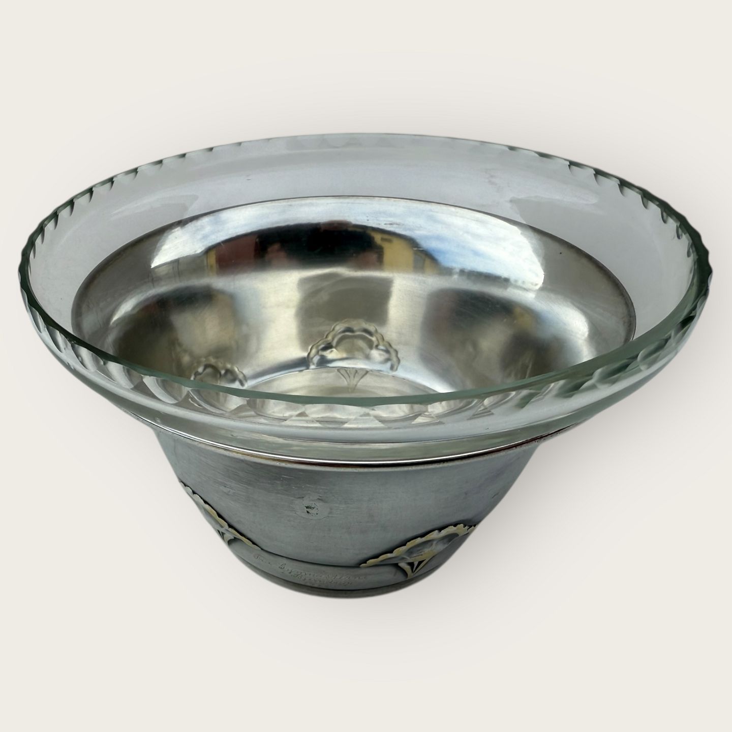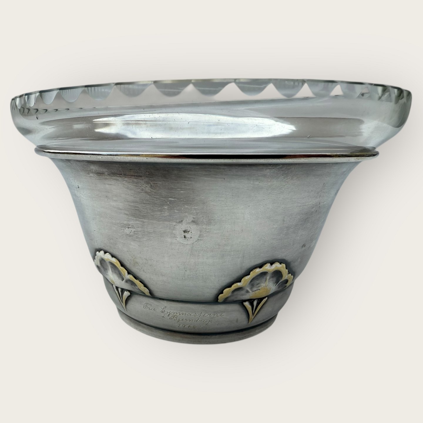Mindre sølvpletskål med glasindsats, højde 8,5cm, diameter 13,8cm, glasindsatsen i fin stand, sølvpletskålen med patina og indgraveret: Fra gymnasterne i Bjerndrup 1942