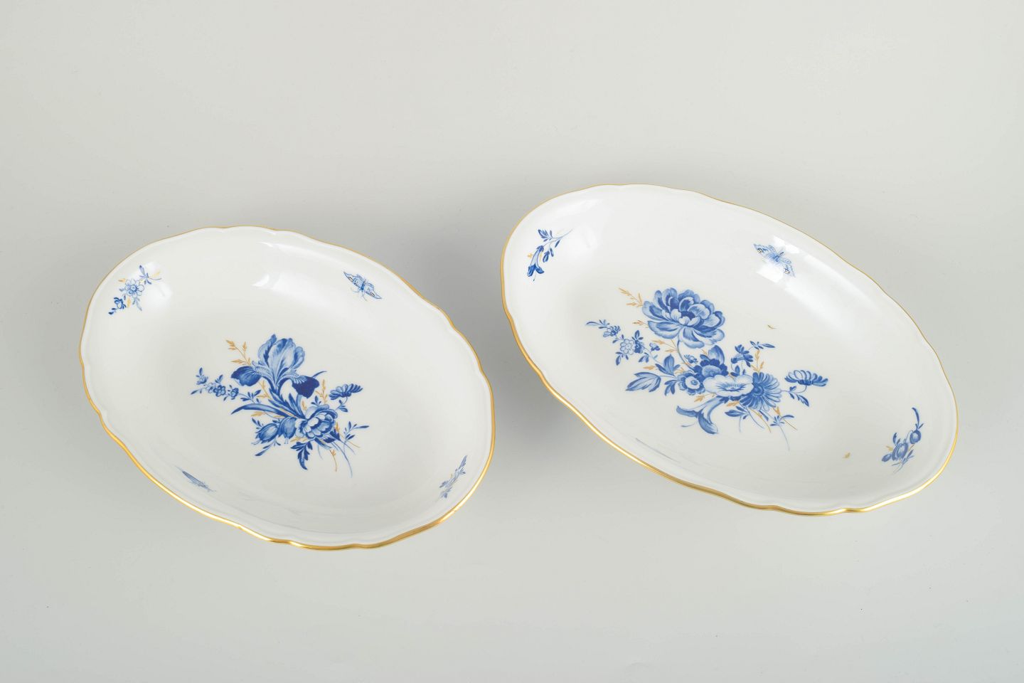 Hånddekoreret porcelæn med håndmalede blå blomsterdekorationer og forgyldt staffering langs kanten. Klassisk elegant Meissen-form med let bølget rand.