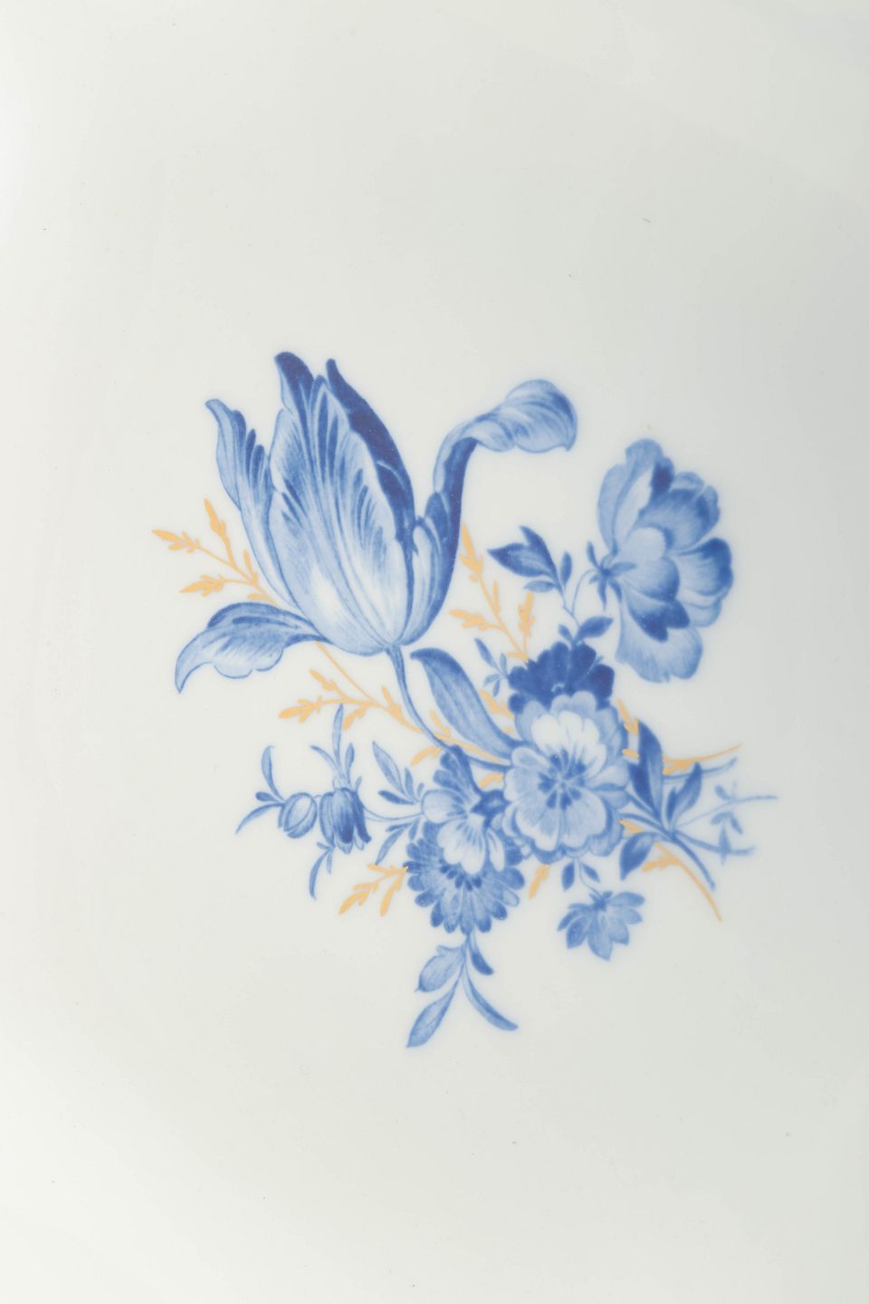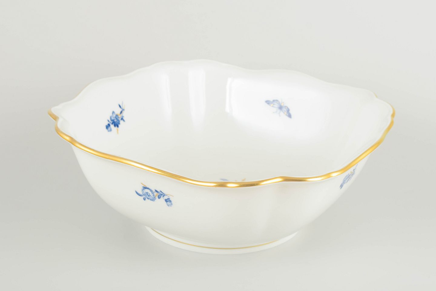 Hånddekoreret porcelæn med håndmalede blå blomsterdekorationer og forgyldt staffering langs den bølgende kant. Let asymmetrisk og organisk form.