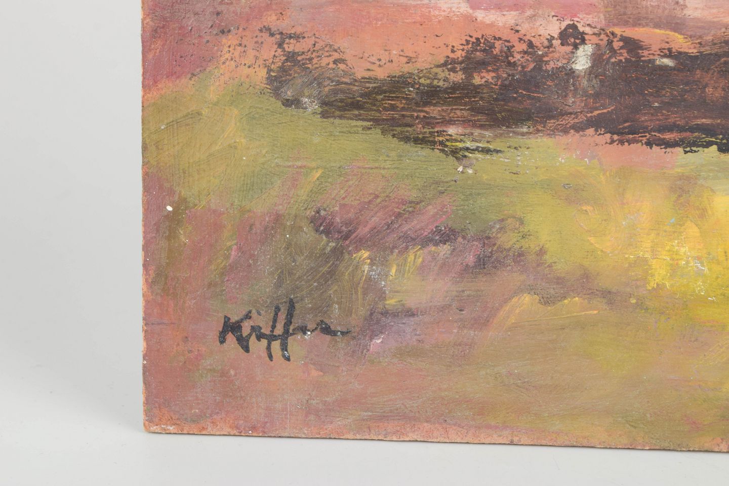 Stemningsfuldt impressionistisk landskab med bred horisontlinje under en lys, næsten opløst himmel. De varme jordfarver i forgrunden møder et diset rosa-brunt bælte af træer og buskads, udført med bløde, atmosfæriske penselstrøg. Et poetisk og stille naturmotiv, hvor lys og tone danner billedets egentlige centrum.