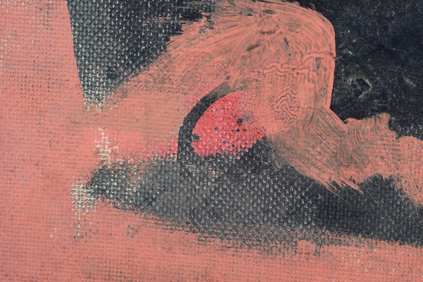 Et råt og gestisk abstrakt værk med et mørkt centralt felt mod en mat rosa-rød baggrund. Malingen ligger tykt og taktilt med spor af paletkniv og stofflig struktur, hvilket skaber en ekspressiv og næsten materiel tilstedeværelse. Farvekontrasten mellem det sorte og det rødrosa giver kompositionen en intens og gådefuld karakter.