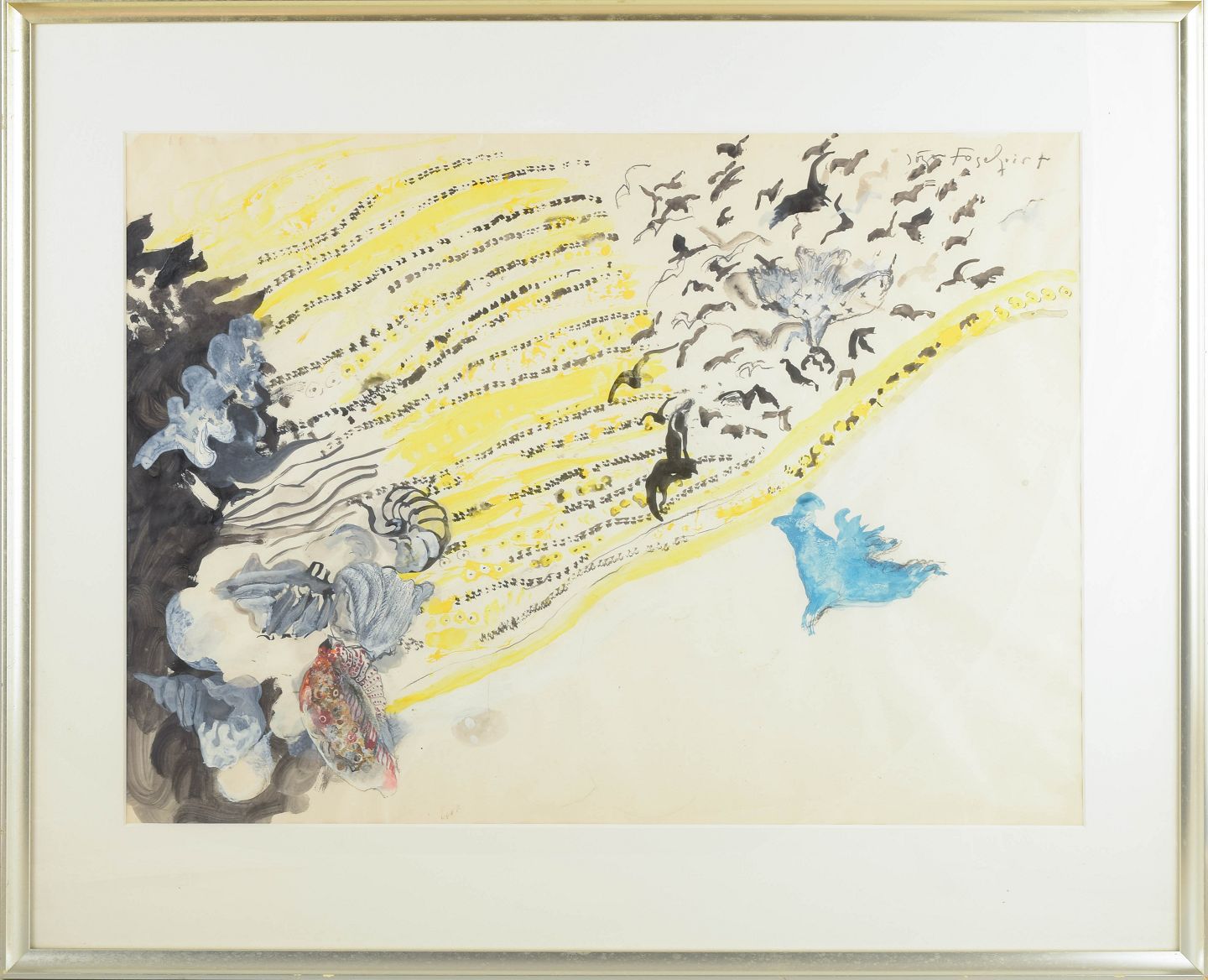 Et poetisk og bevægelsesfyldt akvarelmaleri, hvor musikalske gule rytmer bølger diagonalt gennem billedet og opløses i en sværm af flyvende fuglesilhuetter. Til venstre anes dybere, organiske formationer i blågrå toner, mens en lysere blå figurform svæver frit mod højre. Et værk med drømmende lethed og spirituel energi.