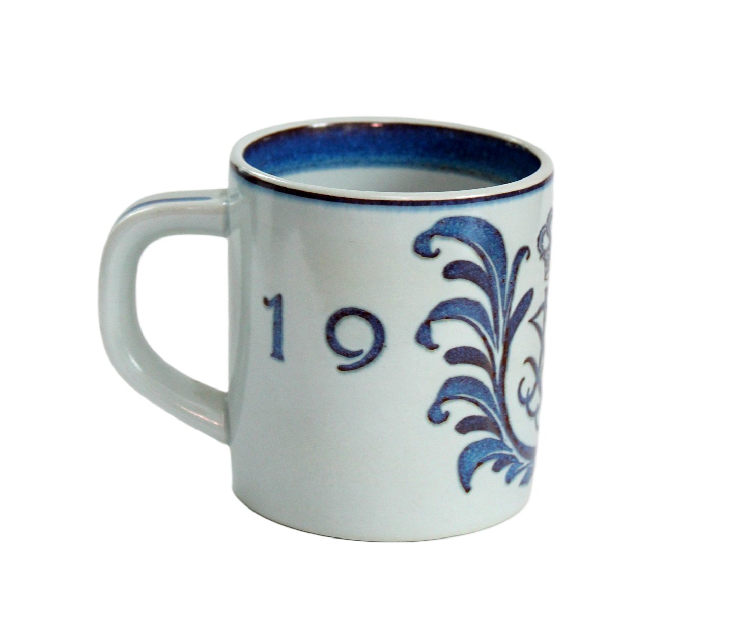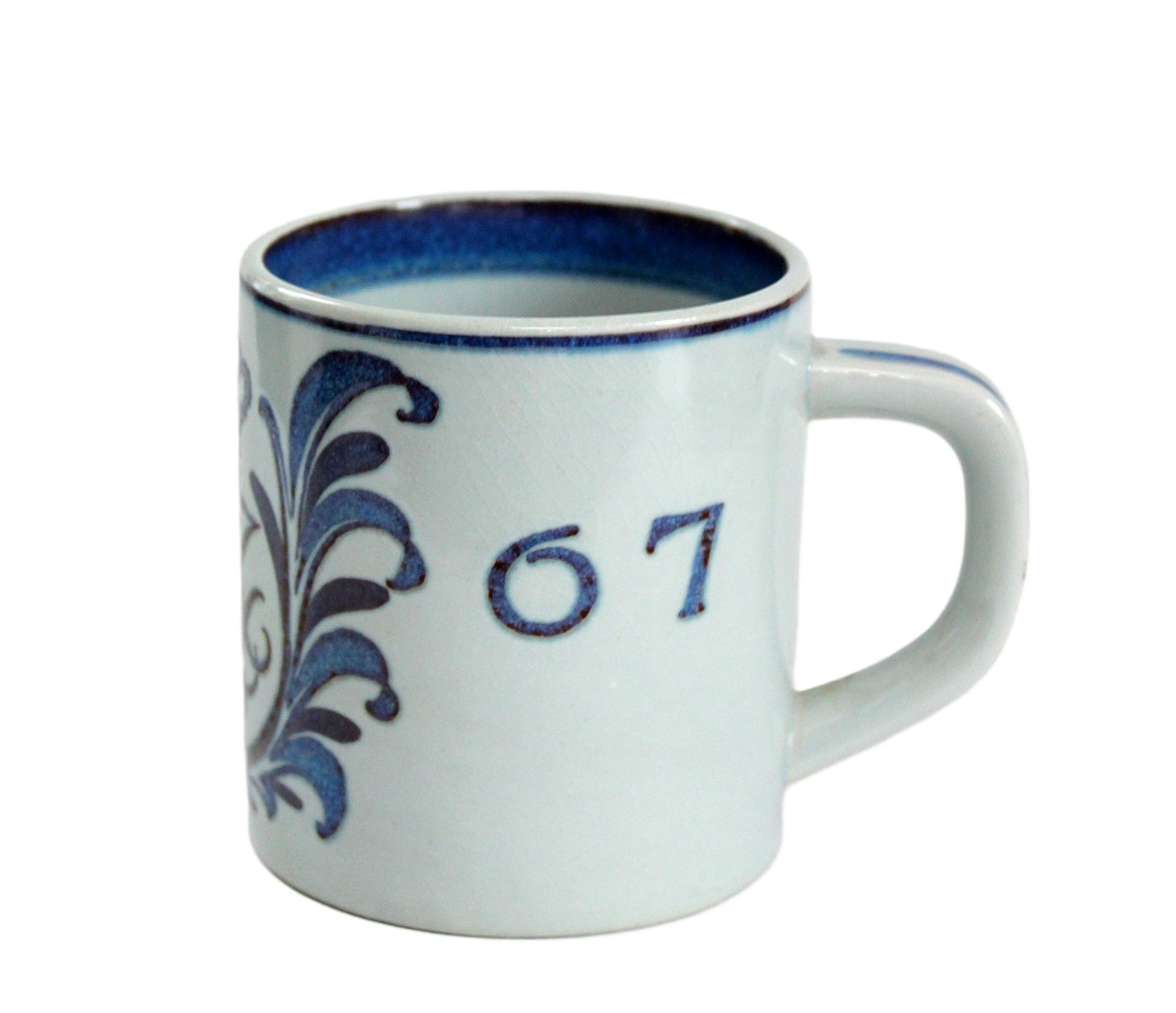 Aluminia, Lille årskrus i kunstfajance 1967. Speciel edition med Dronning Margrethes Monogram. Designer Nils Thorson. Nr. 3495. Højde 7,5 cm. Diameter 6,8 cm. Lettere overfladekrakelering. Pris: 800 kr. stk. Lager: 2