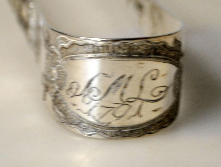 Rococo sukkertang i sølv, 1791. Danmark. Utydelig mester stemplet: FQ. L.: 15,5 cm. Med indgravering: S.L.M 1791.