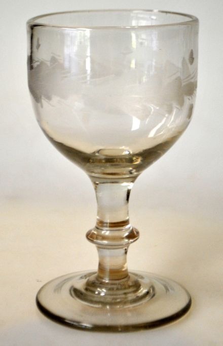 Vinglas med egeløvs slibninger, 19. årh. Danmark. Stilk med knap. Slibninger med 4 blade og 8 agern foroven og forneden. H.: 11 cm.