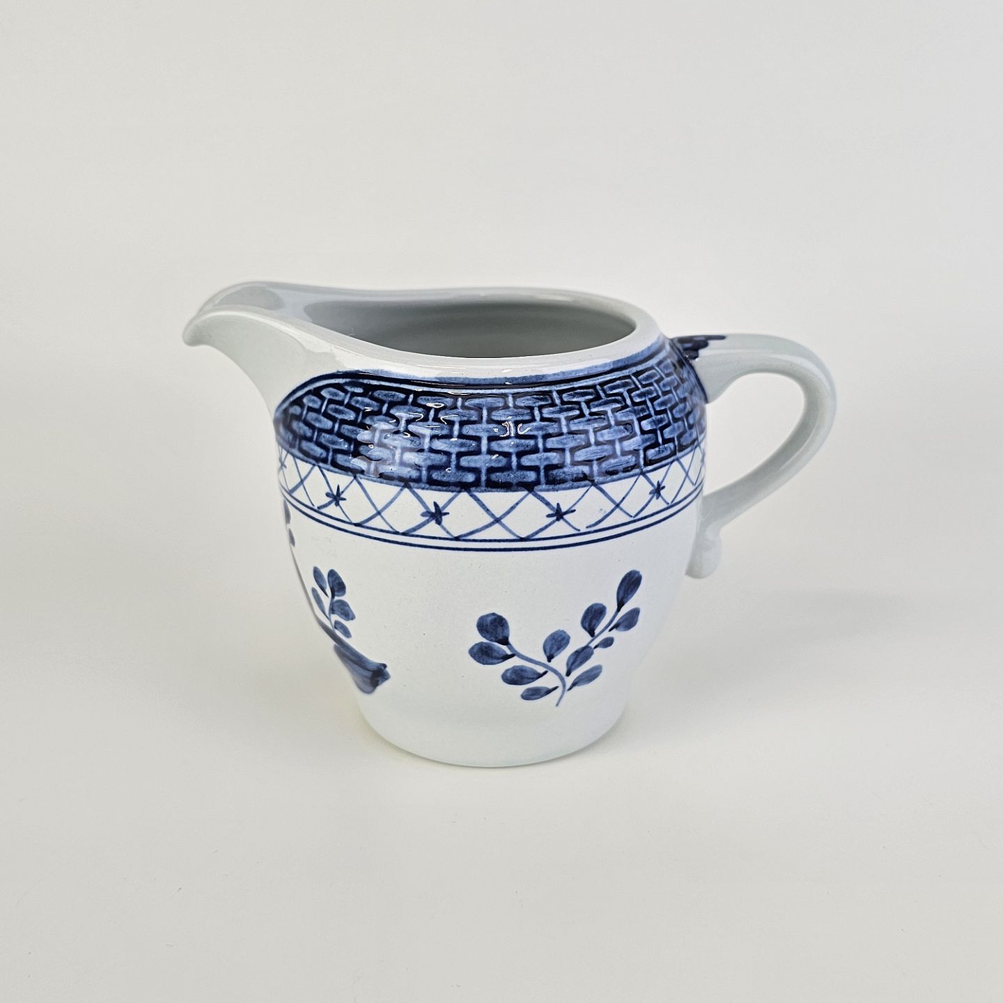 Glat Lyst fajance med blå dekoration af blomster og blå bort.