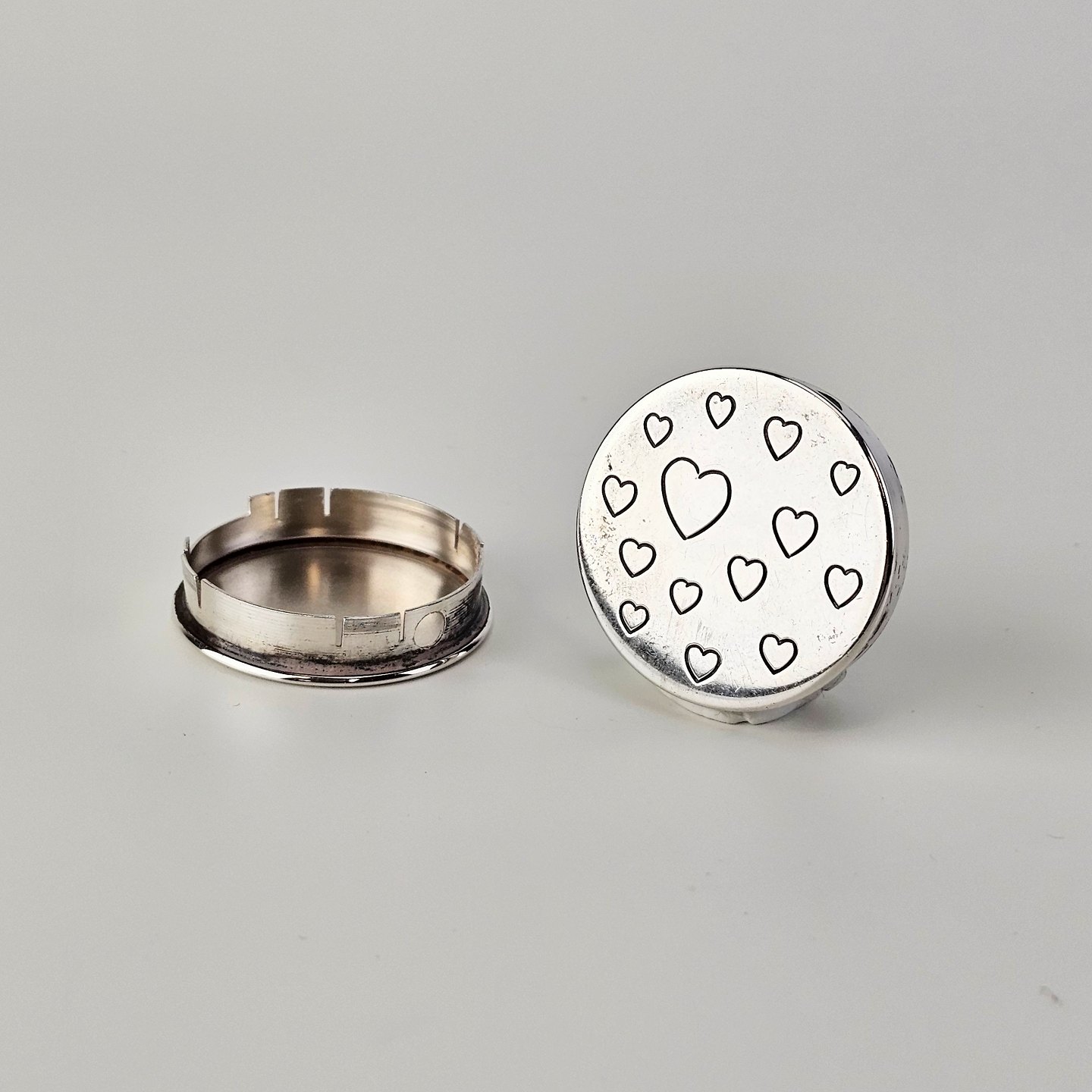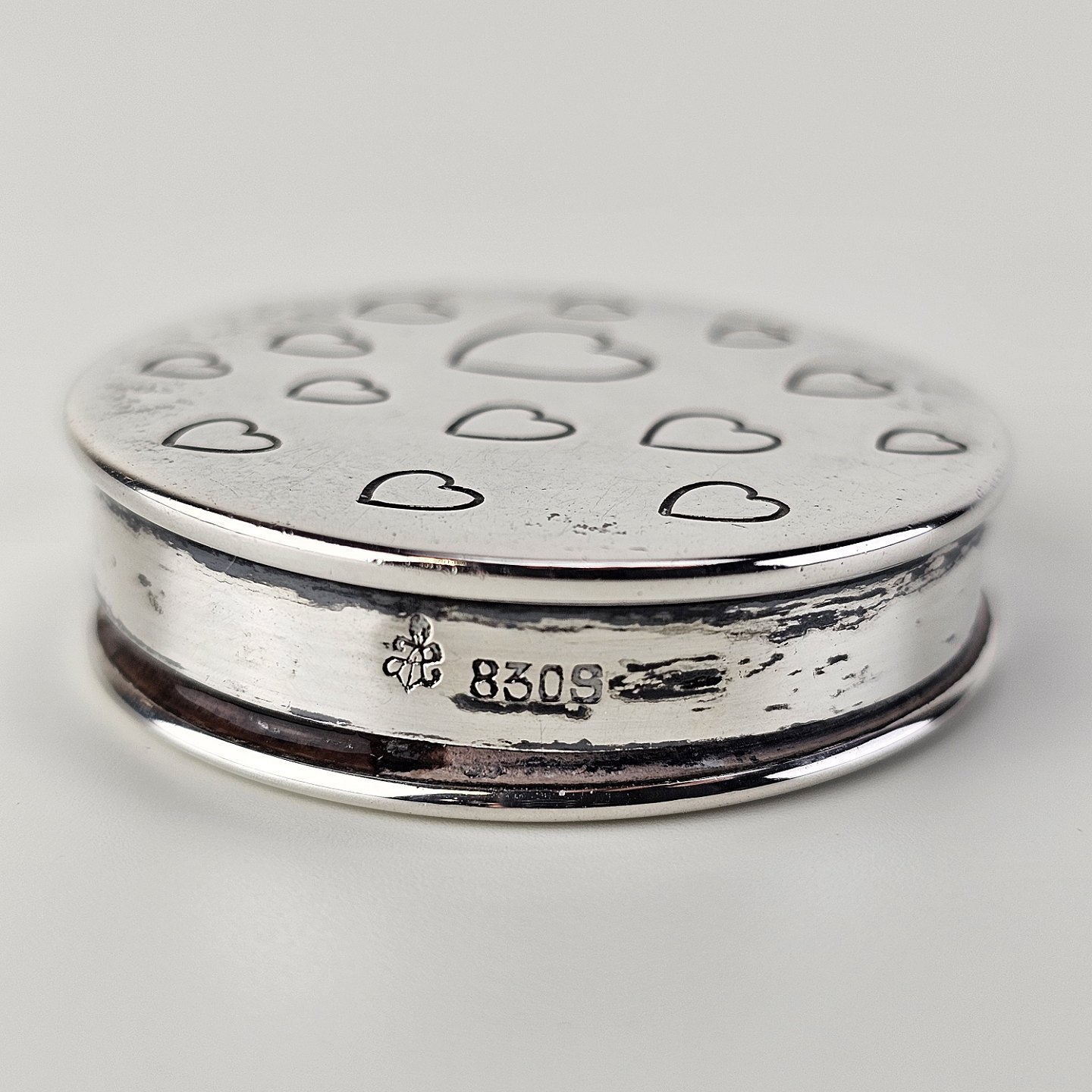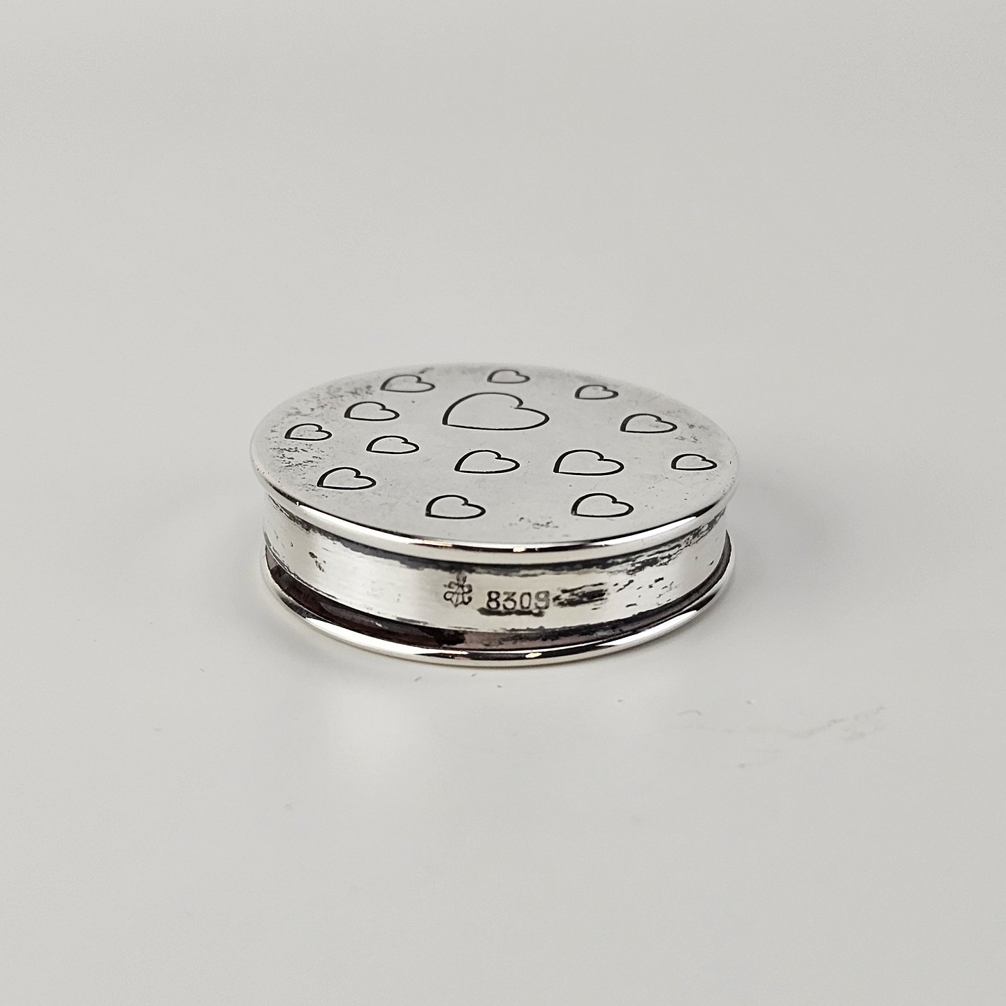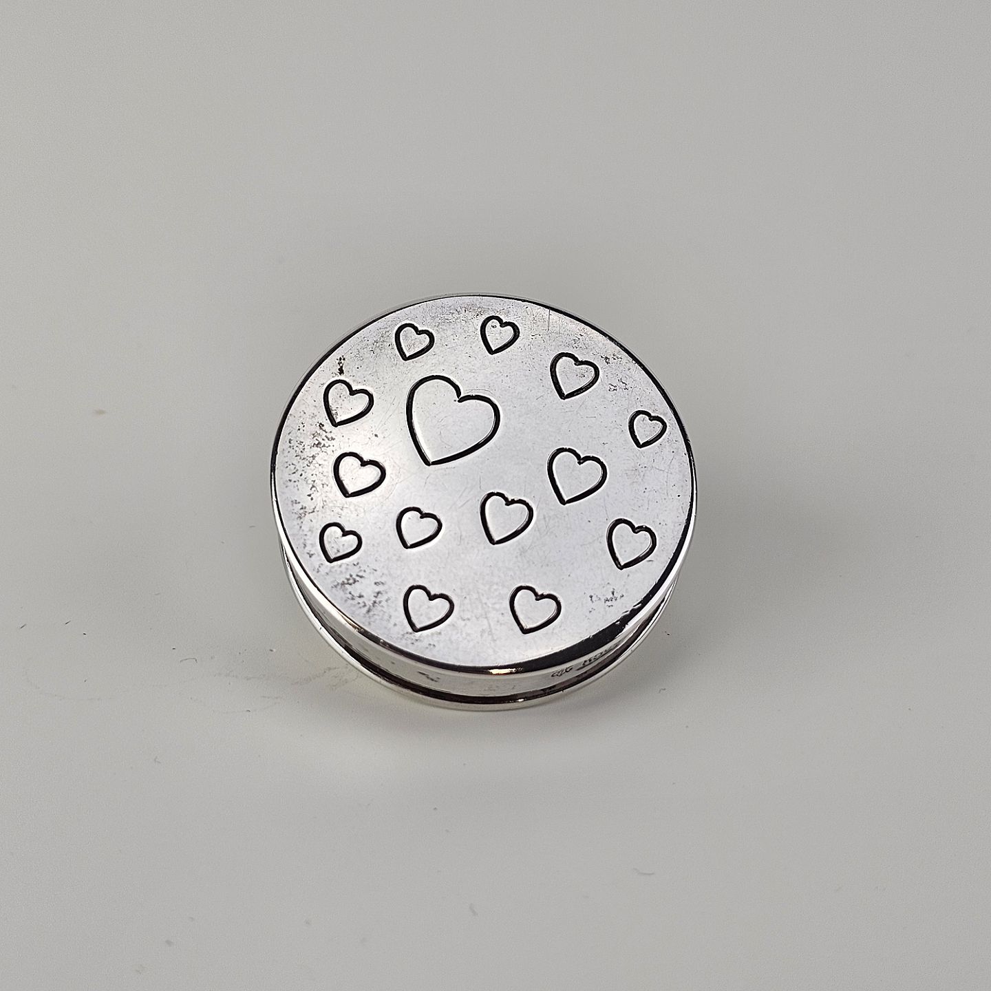 Rund pilleæske i 830 sølv med motiv af indgraverede hjerter