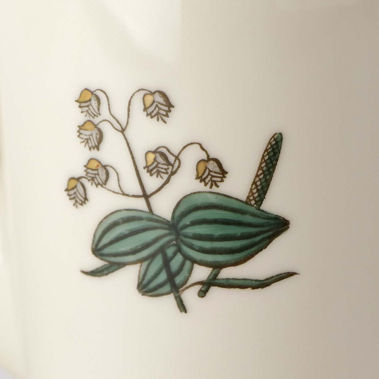 Stel i glat råhvidt porcelæn dekoreret med lysegrøn stribe og guldkant samt motiv af hjertegræs.