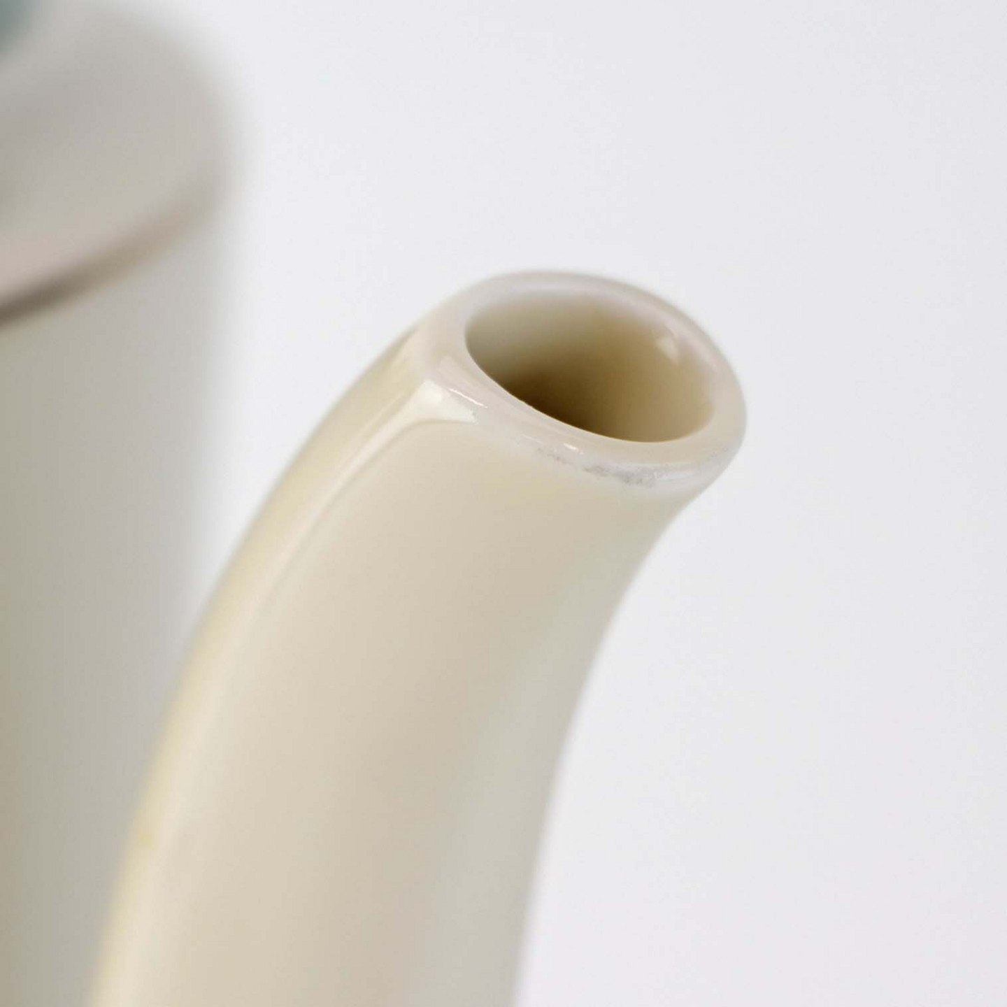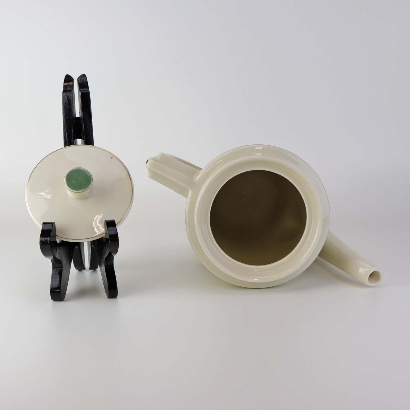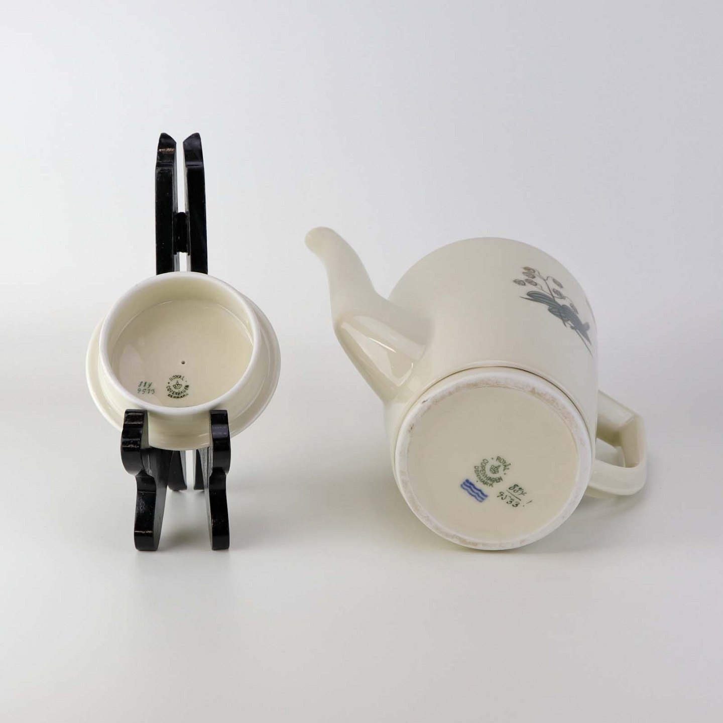 Fremstår med brunt plet under glasuren samt ujævnhed i porcelænet på låget samt mindre brugsspor ved tud.