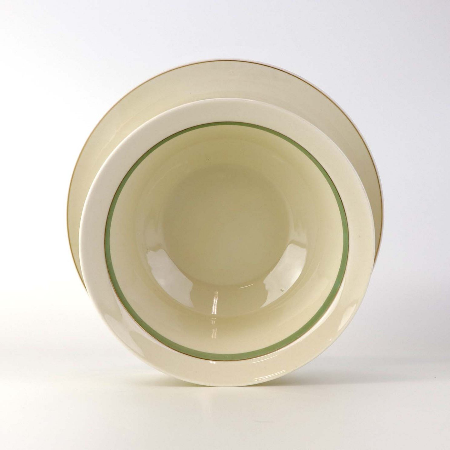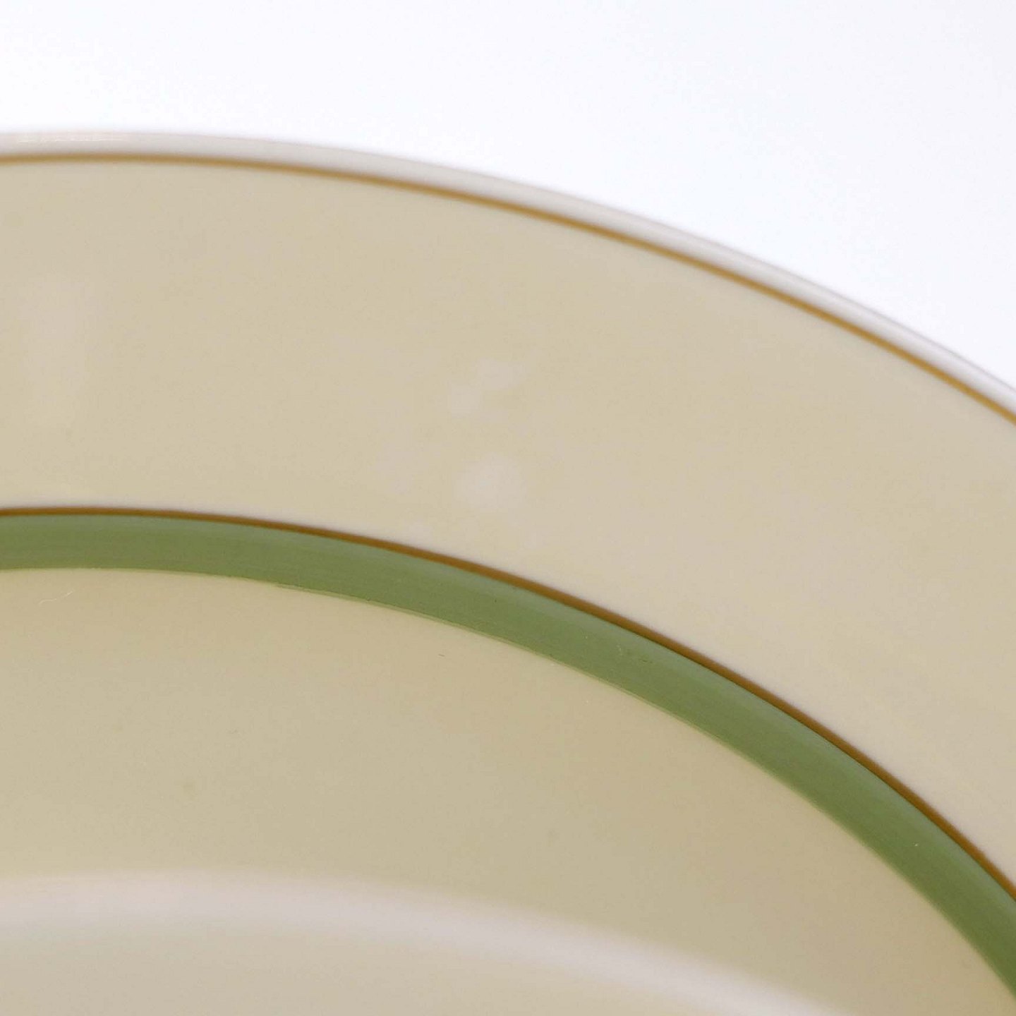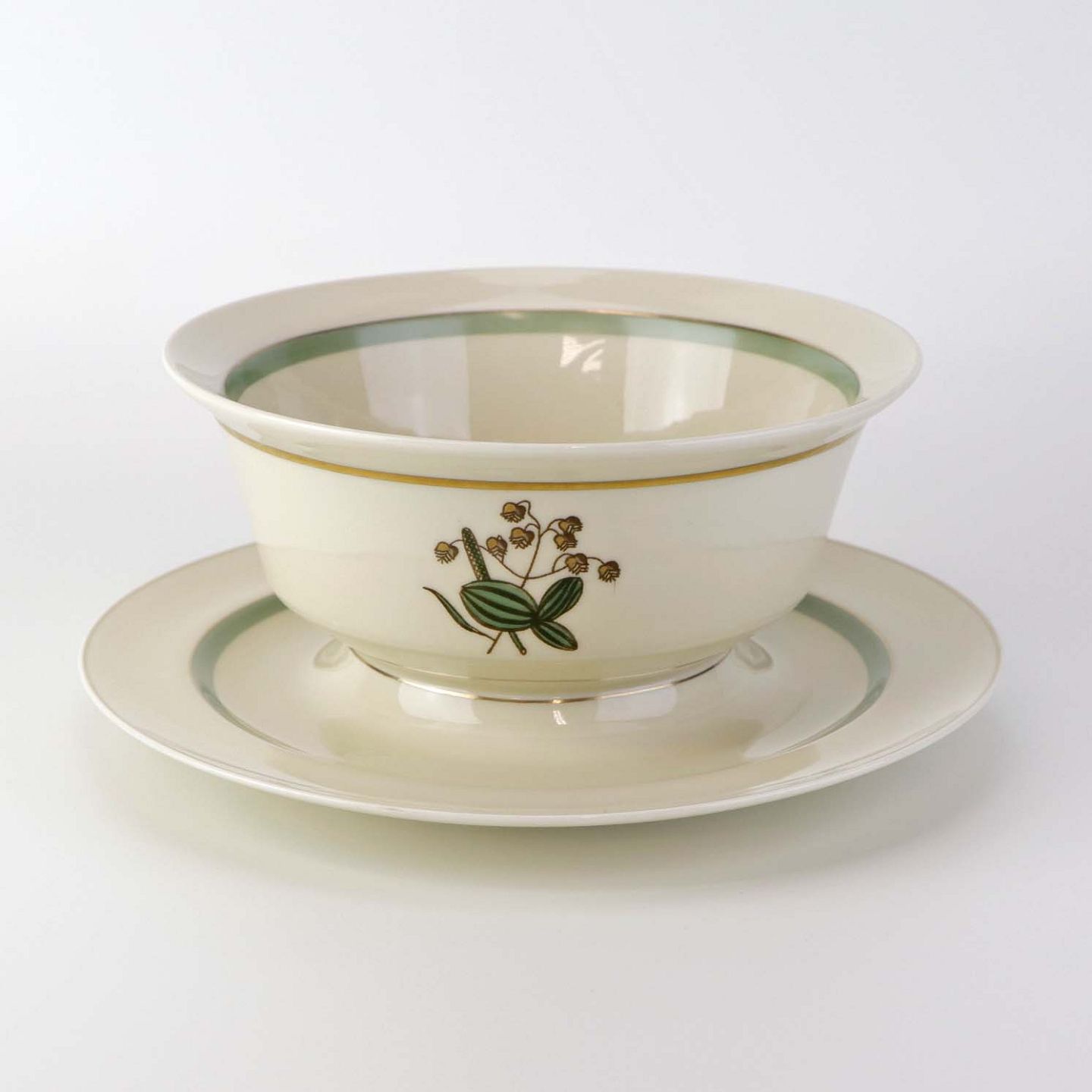 Stel i glat råhvidt porcelæn dekoreret med lysegrøn stribe og guldkant samt motiv af hjertegræs.