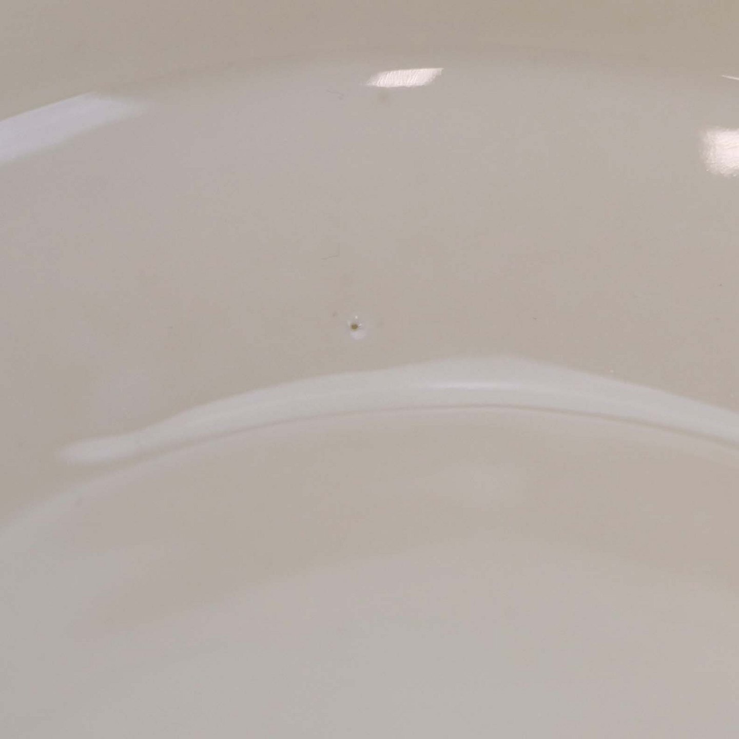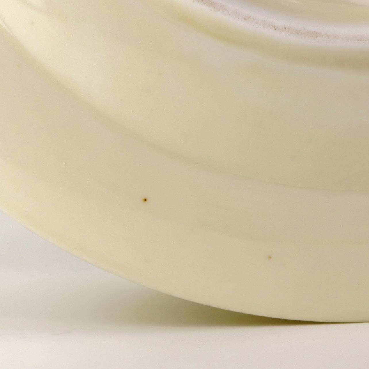 Fremstår med mindre ujævnhed et stedet i porcelænet samt uens glasurfarve ved kant, mindre brugsspor under bund og på guldkanten.
