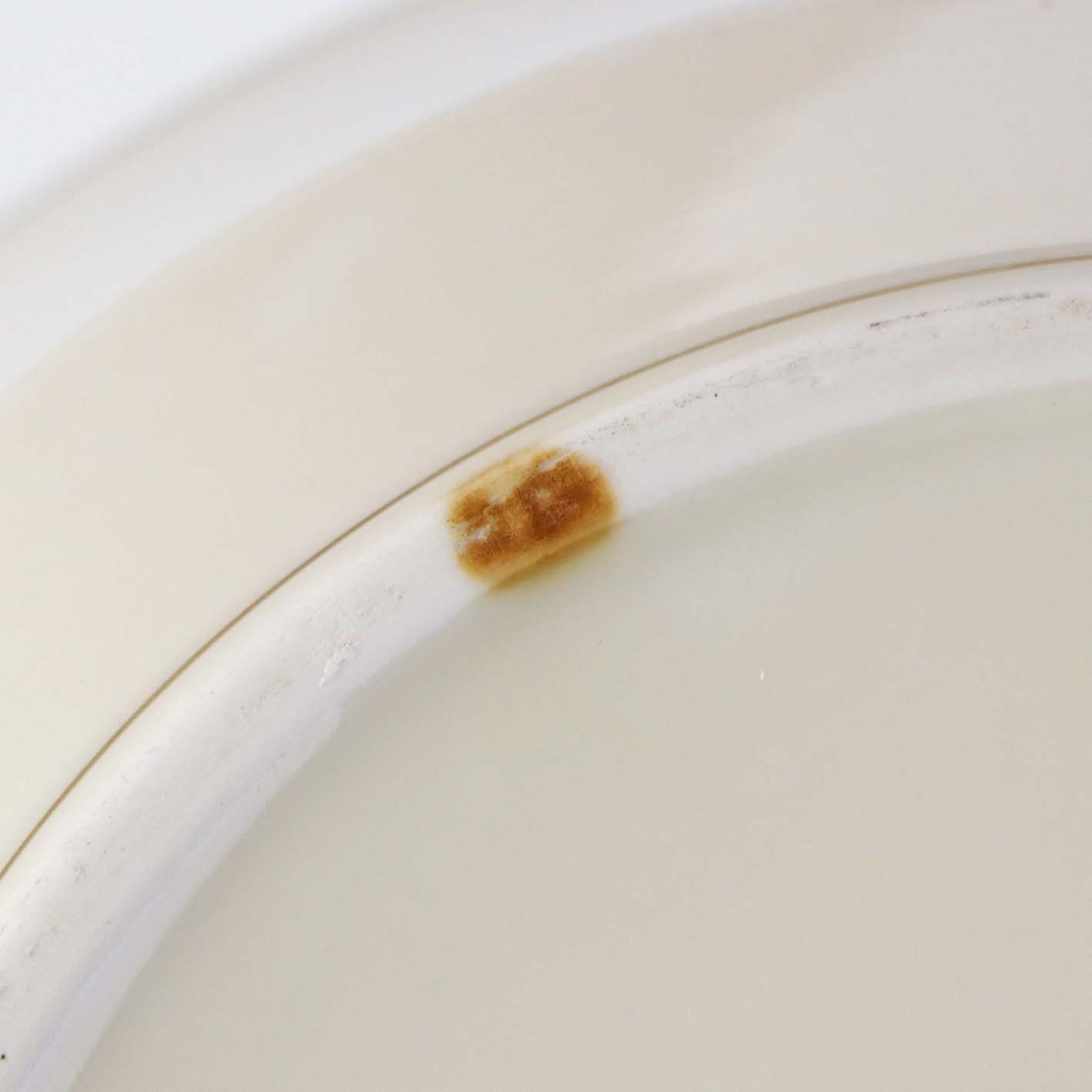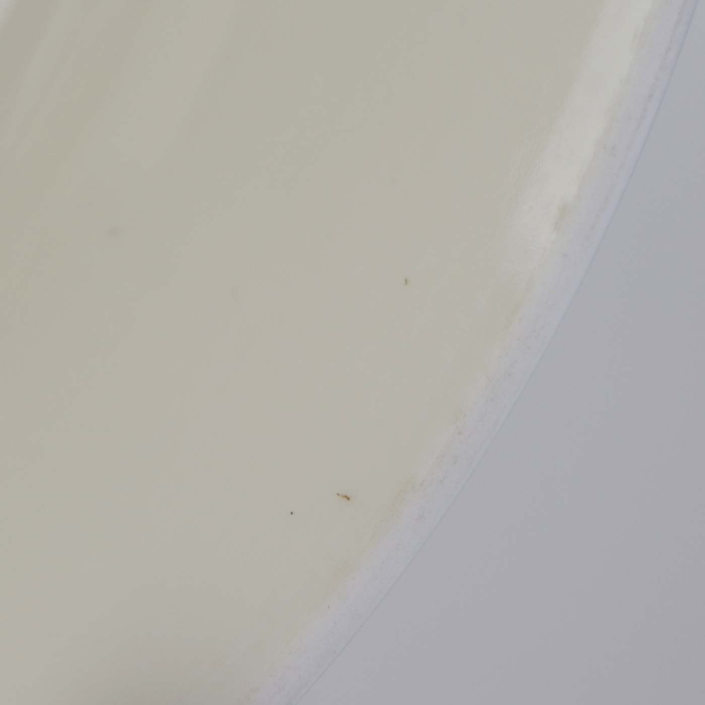 Fremstår med brugsspor på dekorationen ved den ene hank samt på skålens topkant og en brun plet under bunden.