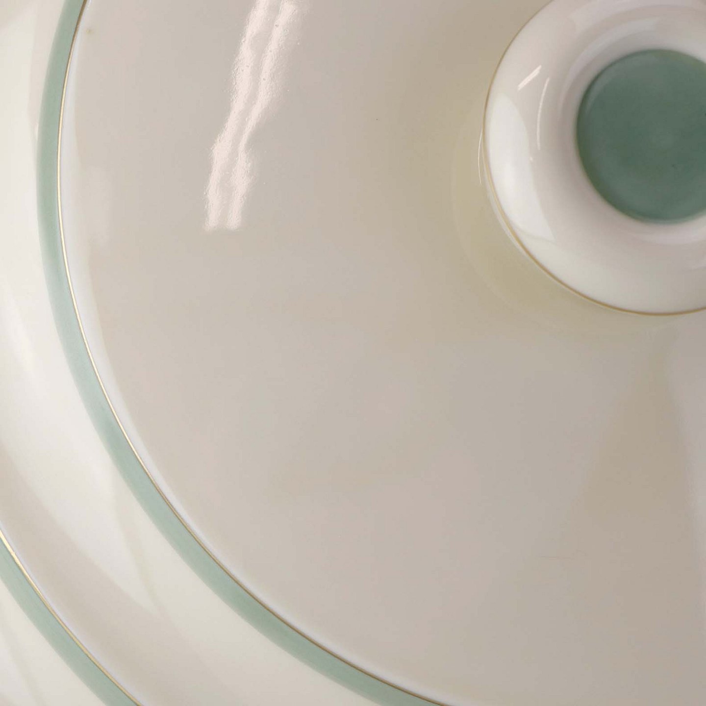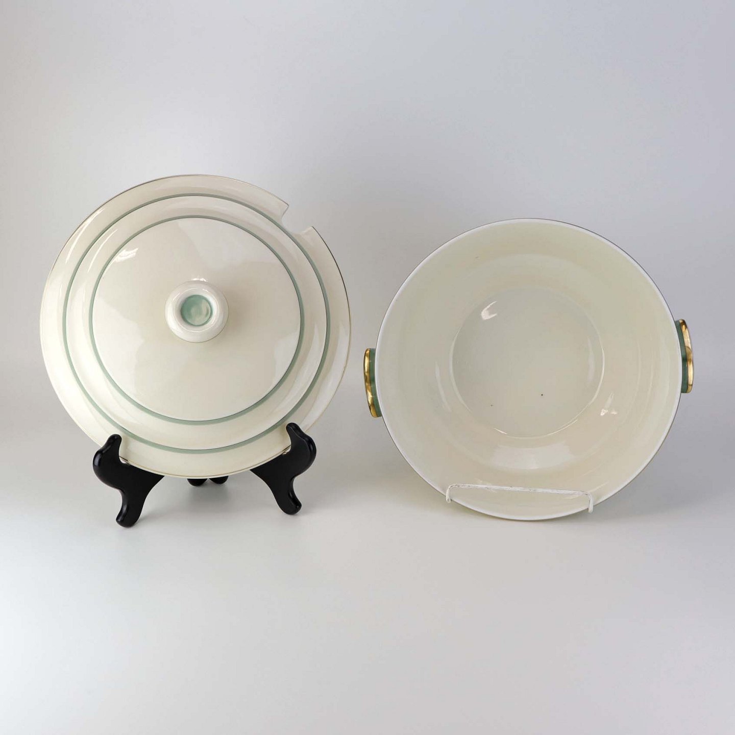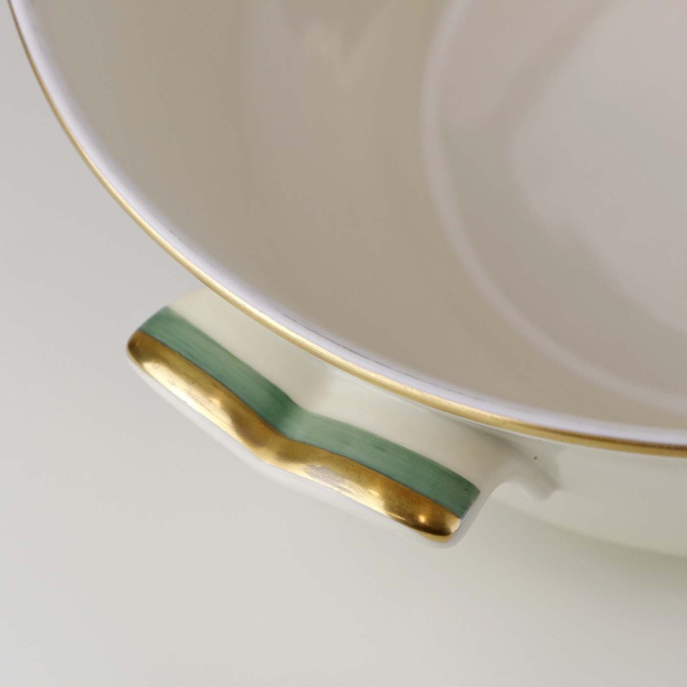 Stel i glat råhvidt porcelæn dekoreret med lysegrøn stribe og guldkant samt motiv af hjertegræs.
