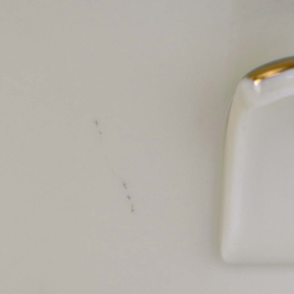 Fremstår med uenshed i glasuren på låget, tre brune pletter under glasuren på indersiden samt lettere slid på guldkanten ved den ene hank.