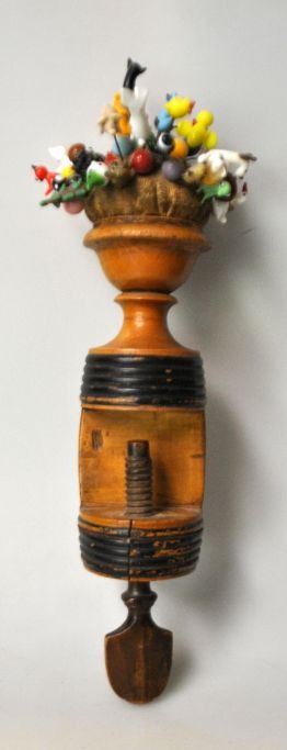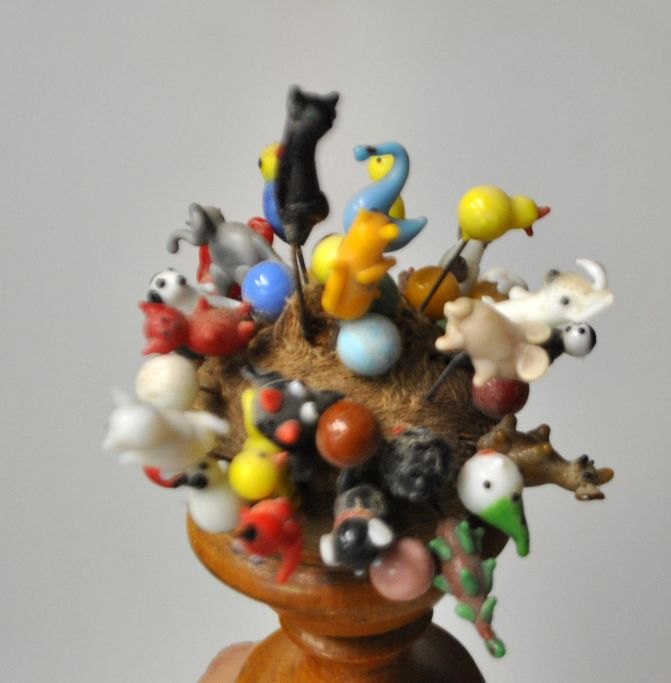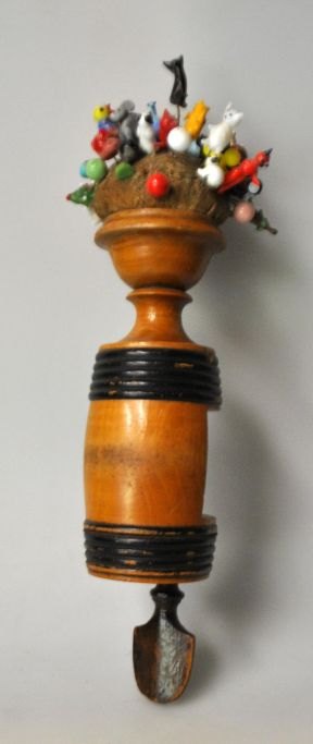 Antik dansk syskrue med nålepude, 19. årh. Danmark. Udformet som en tønde i birketræ med sorte bånd. I nålepude mere end 40 forskellige nåle med glasfigurer, bl.a. elefanter, hunde, katte, høns, ænder m.v. Højde med nåle: 30 cm.