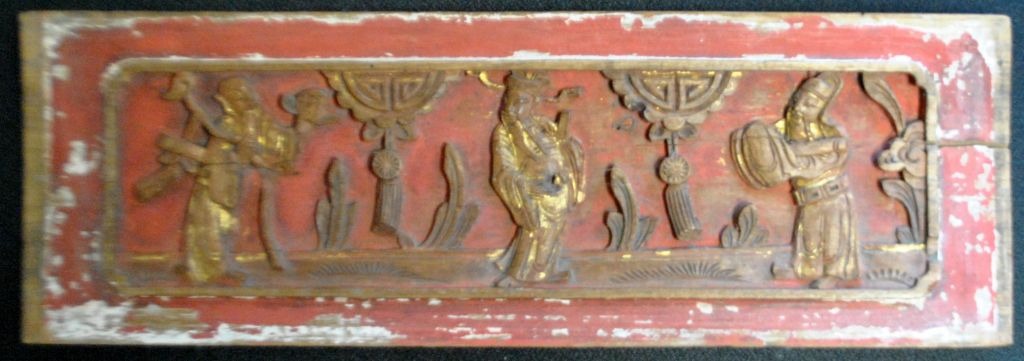 Antik kinesisk bemalet træskæring, 19. årh. Med sceneri med 3 vismænd i naturen13 x 38 cm. . 15 x 24 cm.